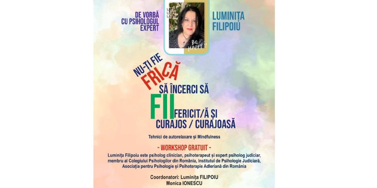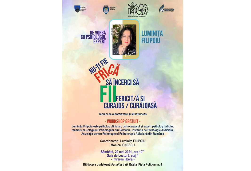 Ai vrea să stai de vorbă cu un psiholog despre gândurile și sentimentele tale dar din diverse motive nu ai reușit să faci acest lucru până acum? Weekendul acesta ai ocazia! Biblioteca Județeană “Panait Istrati” Brăila vă invită sâmbătă, 29 mai, de la ora 10.00, să stați de vorbă cu psihologul în cadrul workshop-ului “Nu-ți fie frică să încerci să fii fericit/ă și curajos/curajoasă”, susținut de Luminița Filipoiu.