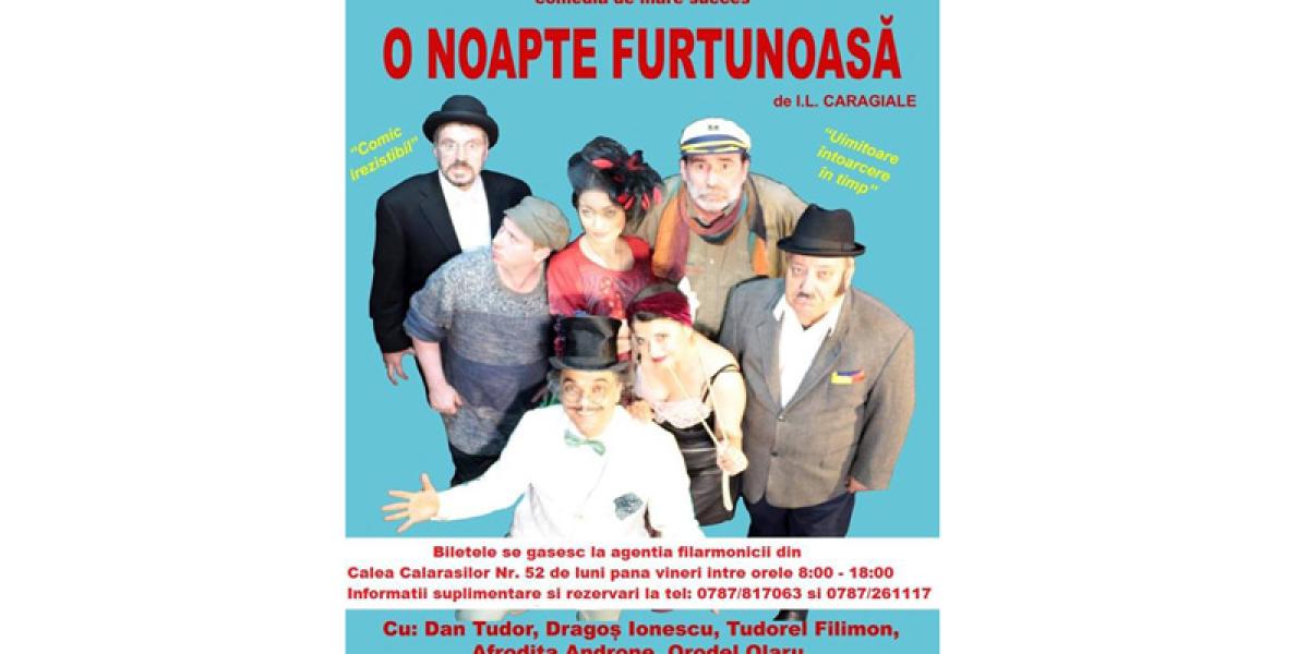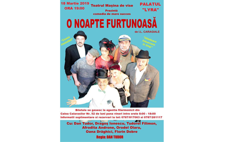 Luni,18 martie 2019, ora 19:00, la Palatul LYRA Brăila, Teatrul “Maşina De Vise” Bucureşti prezintă comedia de succes “O noapte furtunoasă” de I.L. Caragiale, într-o versiune nouă, regizată de Dan Tudor.
