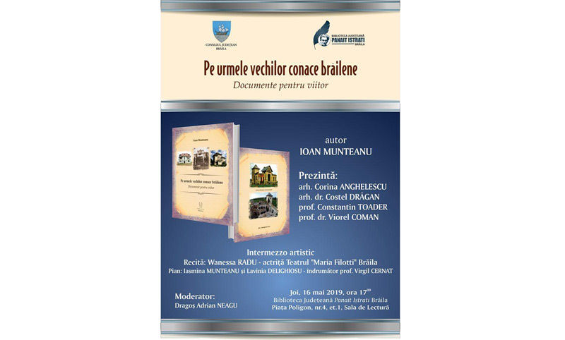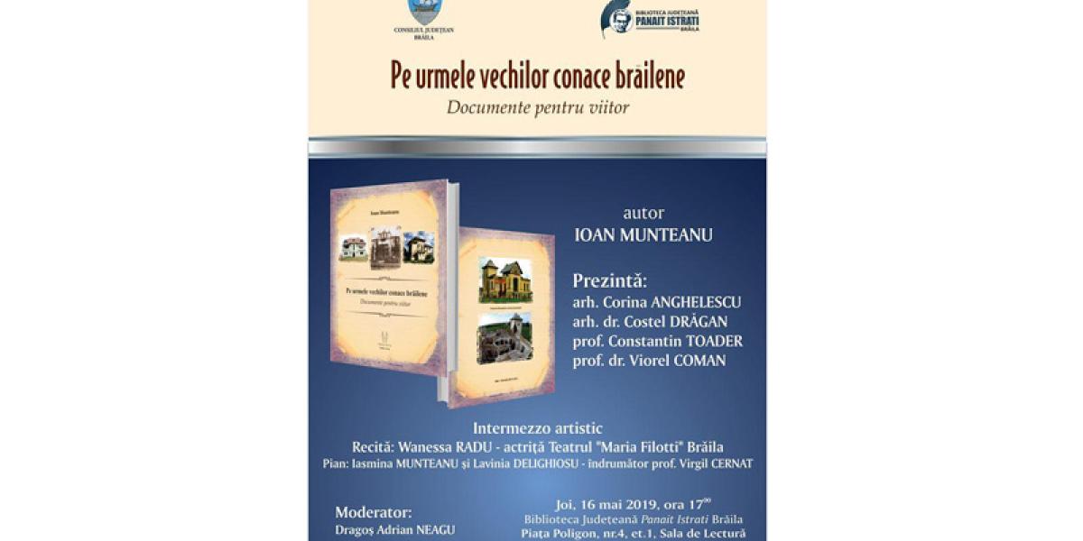 Joi, 16 mai 2019, ora 17.00, la Sala de lectură a Bibliotecii Judeţene “Panait Istrati” va avea loc lansarea volumului “Pe urmele vechilor conace brăilene – documente pentru viitor”, autor Ioan Munteanu.