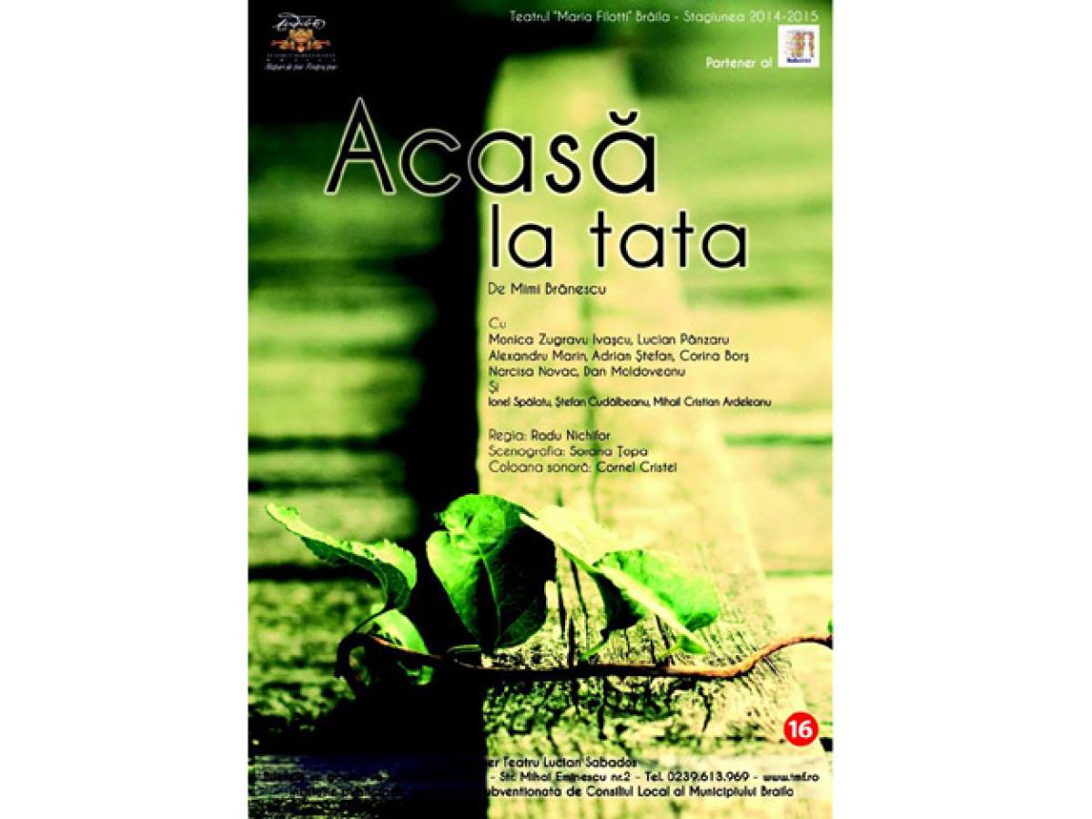 Duminică, 26 noiembrie, de la ora 18.00, la Sala Bujor Macrin, vă invităm la spectacolul “Acasă la tata”, de Mimi Brănescu, regia Radu Nichifor, scenografia Sorana Ţopa. O comedie explozivă, rafinată, plină de ritm şi de situaţii amuzante, un spectacol cu o distribuţie de excepţie formată din actorii Monica Zugravu, Corina Borş, Adrian Ştefan, Alexandru Marin, Narcisa Novac şi Dan Moldoveanu, alături de Lucian Pânzaru de la Teatrul “Fani Tardini” din Galaţi.