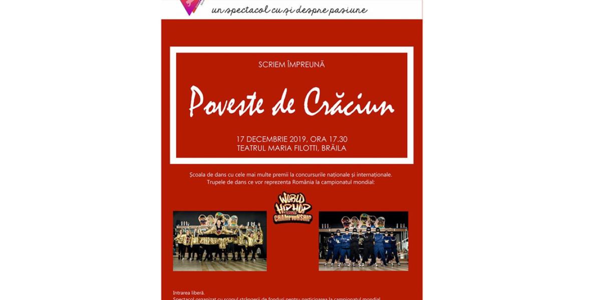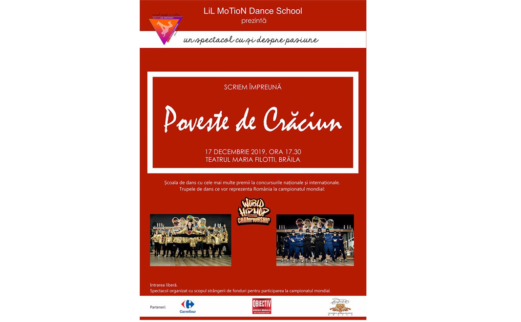 Elevii şcolii de dans, împreună cu coregrafa Liliana Stan, vă invită marţi, 17 decembrie, începând cu ora 17.30, la Teatrul “Maria Filloti”, la spectacolul caritabil “Poveste de Crăciun”. Cele mai bune trupe de dans din Brăila vă invită să petreceţi o seară de poveste, în care veţi fi vrăjiţi de magia dansului. Intrarea este liberă, în limita locurilor disponibile, participanţii fiind invitaţi să facă o donaţie minimă recomandată de 20 lei, o sumă mică dar prin care şi îi sprijiniţi astfel pe talentaţii dansatori să reprezinte din nou cu mândrie Brăila şi România la Campionatul Internaţional de Hip Hop din Statele Unite. La rândul lor, cei din echipa Lil Motion vor aduce o bucurie copiilor mai puţin norocoşi din Brăila. Este vorba despre micuţi din cartierul Chercea, care vor primi pachete de Crăciun.