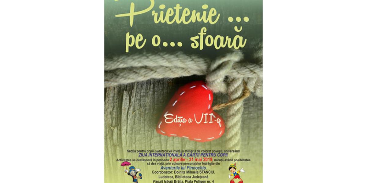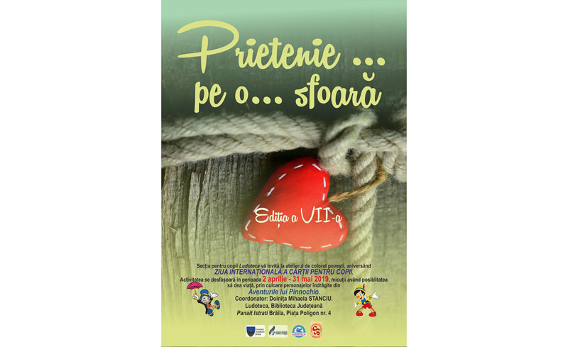 Secţia pentru Copii şi Tineret a Bibliotecii Judeţene “George Bariţiu” Braşov, a iniţiat un parteneriat educaţional naţional dedicat zilei de 2 aprilie “PRIETENIE … PE O … SFOARĂ …” Aflat la cea de-a şaptea ediţie, acţiunile parteneriatului sunt dedicate promovării literaturii pentru copii şi stimulării interesului pentru lectură a celor mici. Sunt încurajate să participe bibliotecile publice, organizaţiile neguvernamentale, cluburile copiilor sau orice alte organizaţii care desfăşoară activităţi cu copiii şi susţin priorităţile parteneriatului. Tema propusă în acest an este dedicată celebrării operei lui Carlo Collodi. Astfel, în perioada 2 aprilie – 31 mai 2019, la Ludoteca Bibliotecii Judeţene “Panait Istrati” Brăila sunt aşteptaţi copiii pentru a ilustra povestea “Aventurile lui Pinocchio”. Desenele realizate de copii vor fi selectate şi ulterior expediate către celelalte biblioteci judeţene partenere, câte 5 pentru fiecare bibliotecă implicată în proiect, care vor constitui 40 de expoziţii. La rândul lor, celelalte biblioteci vor proceda în aceeaşi manieră. Astfel, fiecare dintre cele 40 de expoziţii va conţine câte 5 desene din fiecare oraş participant, iar desenele vor fi expuse într-un mod inedit, pe o … sfoară. Ziua Internaţională a Cărţii pentru Copii, marcată anual pe 2 aprilie, este prilejul ideal pentru promovarea literaturii pentru copii şi pentru stimularea dorinţei de lectură a celor mai mici cititori. Data nu a fost aleasă întâmplător ca sărbătoare a cărţilor pentru copii; Ea coincide cu ziua de naştere a celui mai îndrăgit autor de basme, Hans Christian Andersen.