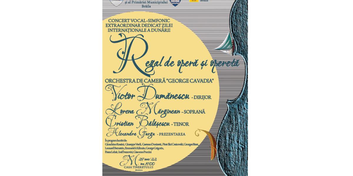 O altă stagiune își scrie acordurile cadenței finale în care sunt imortalizate simțirile concertelor ce au fost, dar și gândurile despre concertele nenăscute încă ale stagiunii viitoare. Filarmonica "Lyra - George Cavadia" Brăila marchează acest moment printr-un Concert vocal-simfonic extraordinar, denumit, cu toată puterea cuvântului, "Regal de operă și operetă", o experiență aparte, pe care o veți trăi prin și alături de invitații Maestrul Victor Dumănescu, din a cărui baghetă dirijorală izvorăsc de fiecare dată viziuni interpretative memorabile, soprana Lorena Mărginean, tânăr muzician care deja a cucerit publicul atât prin delicatețea sa, cât și prin calitățile vocale incontestabile, și nu în ultimul rând tenorul Cristian Bălășescu, fiu al Brăilei, ce a profitat de zestrea sa muzicală și pe care a îmbogățit-o prin muncă, fiind în prezent Prim Solist al Operei Naționale Române Timișoara. Concertul are dublă însemnătate, el fiind dedicat Zilei Internaționale a Dunării și vă va purta într-o croazieră muzicală de-a lungul undelor sonore.