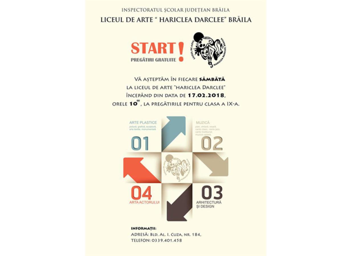 În fiecare sâmbătă, de la ora 10.00, elevii care vor să studieze în clasa a IX-a şi a V-a la Liceul de Arte “H. Darclee” se pot pregăti gratuit pentru probele de aptitudini. Pregătirile se desfăşoară până în luna mai, la următoarele specializări: Arte plastice şi decorative, Arhitectura, Arte ambientale şi Design, Arta actorului, Muzică.