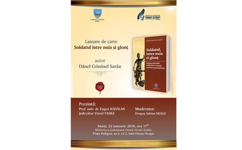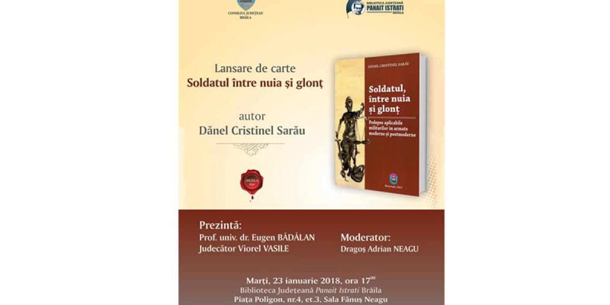 Marţi, 23 ianuarie 2018, de la ora 17.00, la Biblioteca Judeţeană „Panait Istrati” Brăila sala „Fănuş Neagu” va avea loc lansarea cărţii „Soldatul între nuia şi glonţ. Pedepse aplicabile militarilor în armate moderne şi postmoderne”, autor Dănel Cristinel Sarău. Evenimentul va fi prezentat de prof. univ. dr. Eugen Bădălan şi judecător Viorel Vasile şi va fi moderat de Dragoş Adrian Neagu, directorul instituţiei gazdă.
