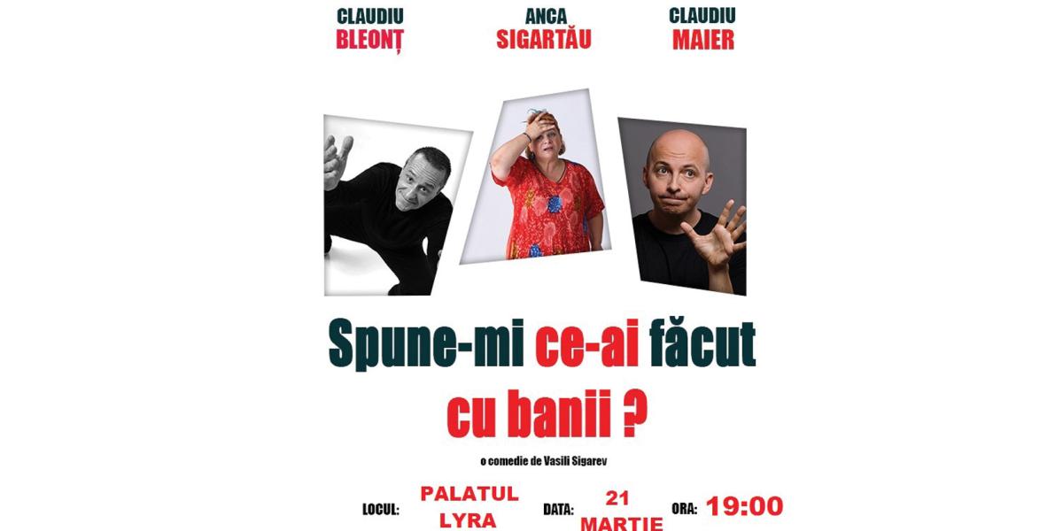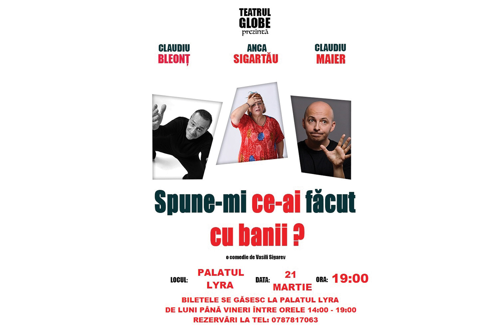 Duminică, 21 martie, de la ora 19:00, la Palatul Lyra Brăila se va juca piesa de teatru “Spune-mi ce-ai făcut cu banii!”, adaptare după V. Sigarev, cu Anca Sigartău, Claudiu Bleonț, Claudiu Maier.