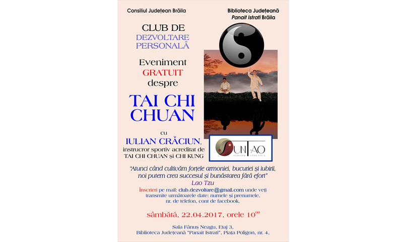 Sâmbătă, 22 aprilie, de la ora 10.00, la Biblioteca Judeţeană “Panait Istrati”- sala “Fănuş Neagu” va avea loc un club de dezvoltare personală “Tai Chi Chuan”. Evenimentul va fi coordonat de Iulian Crăciun, instructor autorizat Tai Chi Chuan şi Chi Kung.