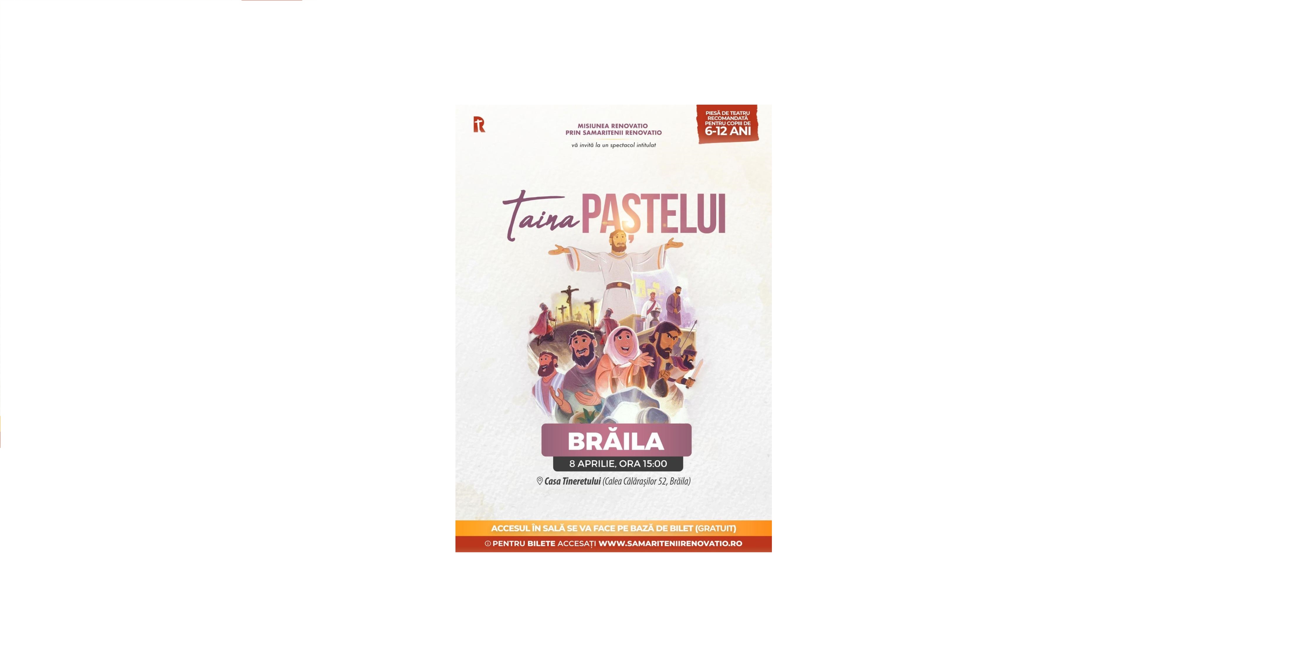 * evenimentul are loc sâmbătă, 8 aprilie, de la ora 15.00, la Casa Tineretului * accesul la spectacol se face pe baza unei invitații, ce poate fi obținută de pe site-ul www.samariteniirenovatio.ro