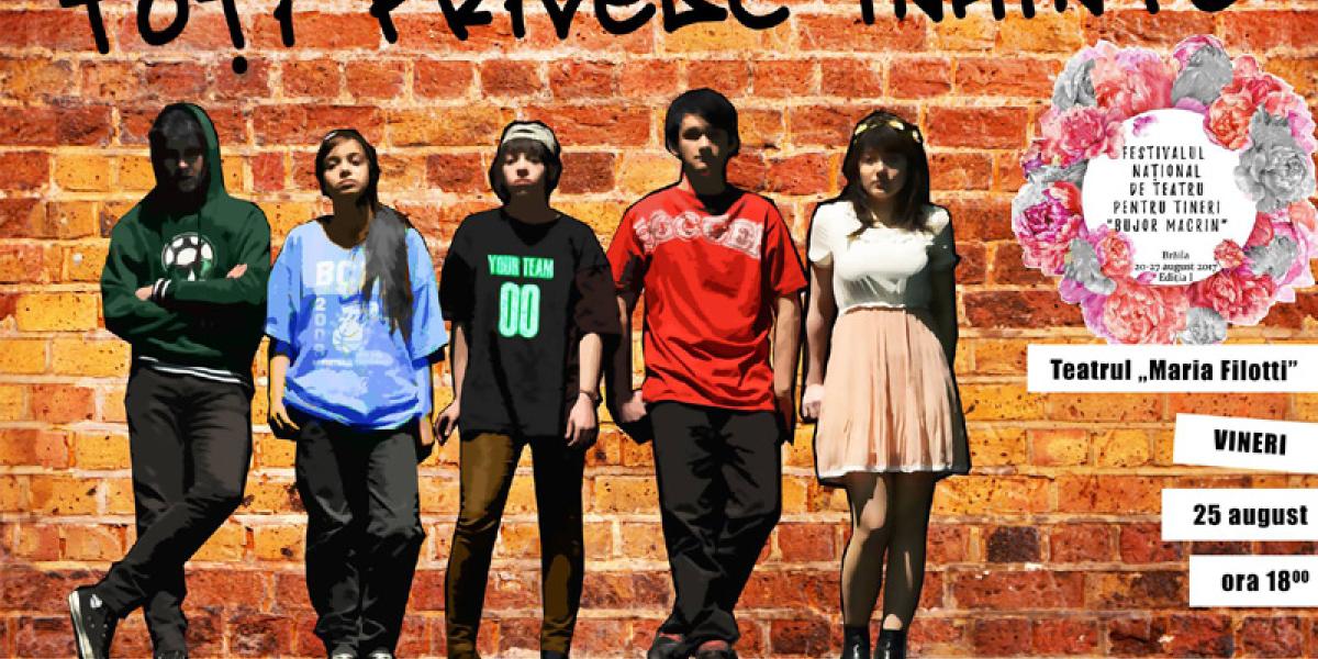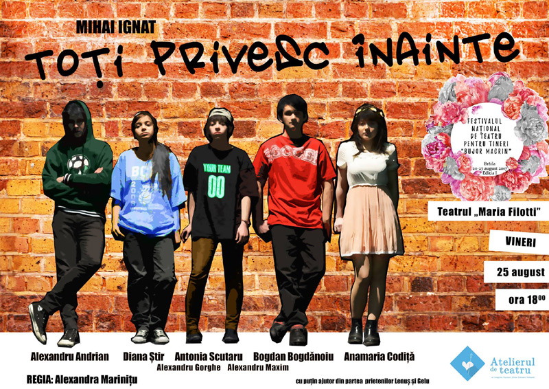 Astăzi, la ora 18.00, în Sala Mare a Teatrului “Maria Filotti” are loc ultimul spectacol din cadrul competiţiei pentru marele premiu al festivalului. “Atelierul de Teatru”, trupă formată din şapte elevi de liceu din Botoşani, vine cu reprezentanţia “Toţi privesc înainte” de Mihai Ignat, regia Alexandra Mariniţu.