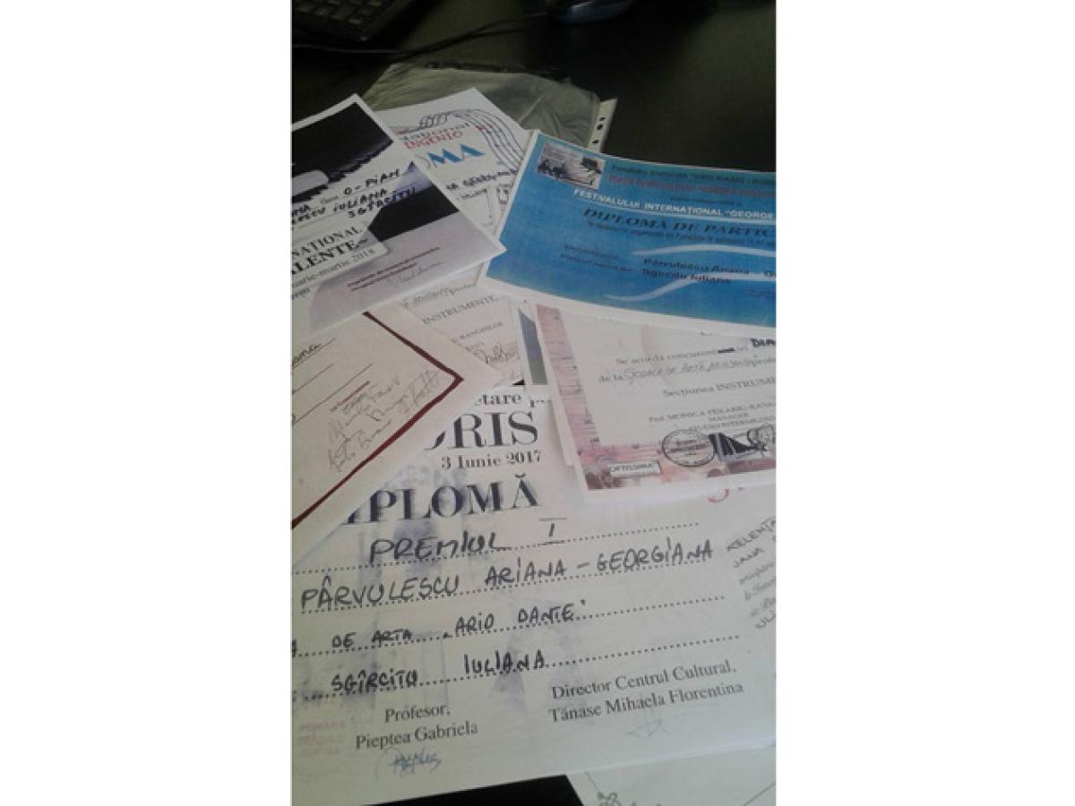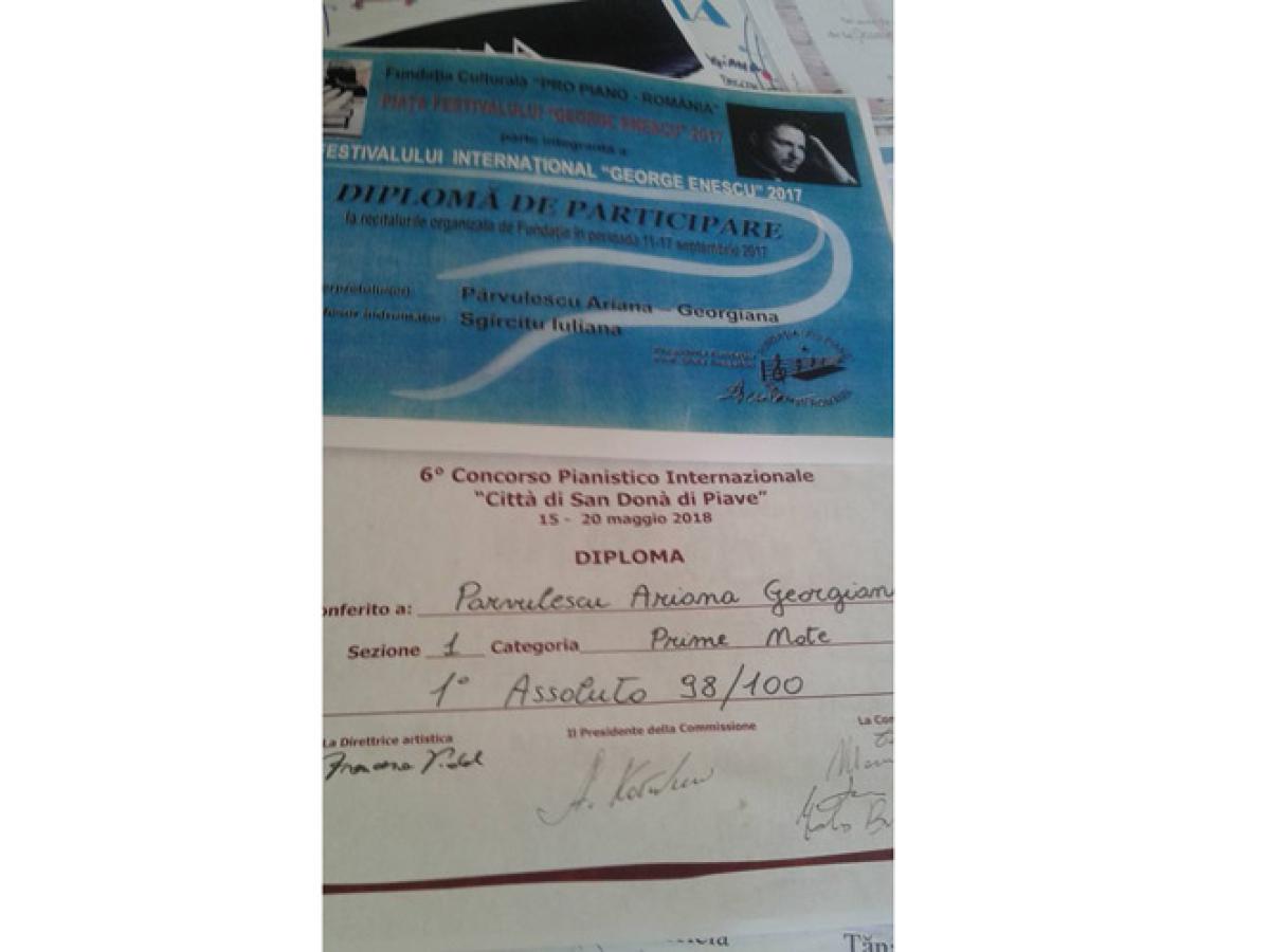 -Aici, aproape de noi, la Galaţi, am participat la concursul internaţional “Miniatura romantică”, la Brăila, am participat la concursul “Virtuozii”, organizat de Şcoala Populară de Artă “Vespasian Lugu” şi am urcat pe podium chiar pe primul loc. În general, pe unde am fost, Şcoala a obţinut premii întâi, trofee, premii de excelenţă, premii speciale, premii de grupă, am mers întotdeauna pe premii de vârf. În toamna anului 2017, Şcoala de Artă “ArioDante” a fost încântată să urce pe scena din Piaţa Festivalului “George Enescu” într-un micro-recital dedicat celor mai talentaţi copii – fiind reprezentată de micuţii pianişti : Karina Alecsia Pogan, Ariana Georgiana Pârvulescu şi Dacian Aştilean Styles. Şcoala se mândreşte cu peste 100 de Premii I, Premii Speciale şi trofee de grupe, iar în luna mai a anului 2018 se adaugă acestei liste primul Concurs Internaţional, unde a avut onoarea să reprezinte România la cel mai înalt nivel. Dintre cei patru reprezentanţi ai României din cadrul Concursului Internaţional “Città di San Donà di Piave”- Italia, Veneţia, cursanta noastră, Ariana Georgiana Pârvulescu a fost singura care a urcat pe podium, clasându-se pe prima poziţie cu Premiul I Absolut, cel mai mare punctaj al juriului de la categoria ei de vârstă.