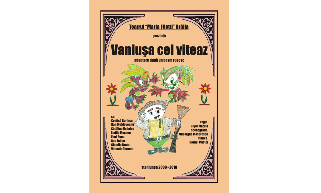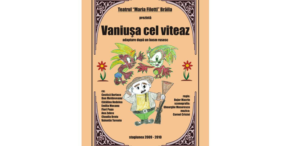 Joi, 28 martie, de la ora 12,30, la Teatrul “Maria Filotti”, Sala Bujor Macrin se joacă VANIUŞA CEL VITEAZ adaptare după un basm rusesc, regia Bujor Macrin. “Vaniuşa cel Viteaz” este o poveste despre trei surori: două arţăgoase, lacome şi rele şi una harnică, blândă şi inimoasă. Surorile mai mari îi cer tatălui lor ca la întoarcerea din călătorie să le aducă daruri scumpe, rochii şi mărgăritare. Taniuşa, modestă şi visătoare, îşi va dori doar o floare fermecată, iar aventurile călătoriei în căutarea ei, vor implica personajele în numeroase întâmplări primejdioase.