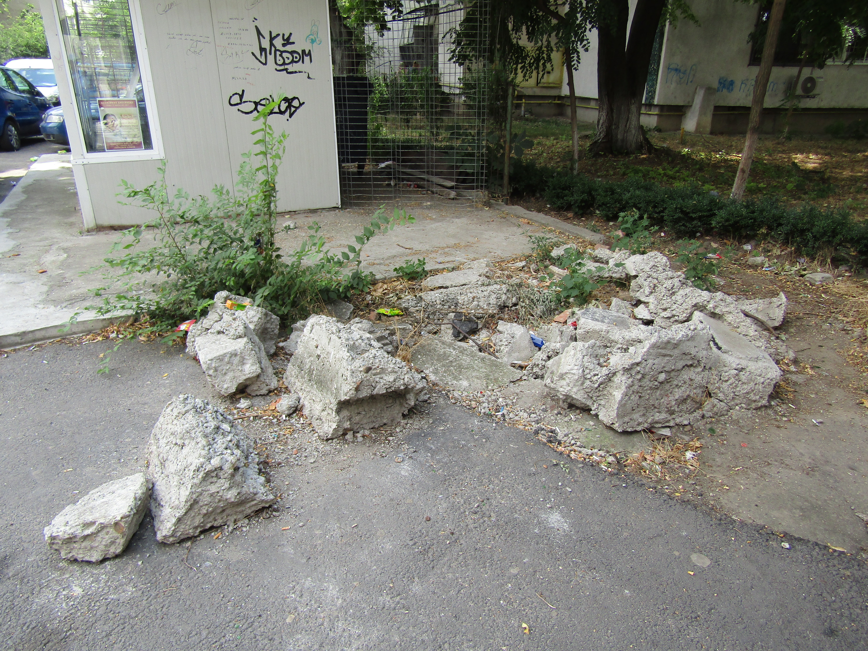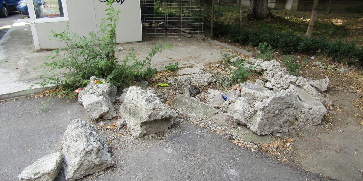 Subiectul rămâne deschis și, din păcate, ajungem la nedoritele “vestigii” care sluțesc zonele unde au rămas abandonate de ani de zile. De exemplu, chiar în fața… muzeului amintit, o bucată din beton în care este încastrată o tablă ruginită amintește de postamentul fostului bancomat pentru parcarea auto, montat acolo în anul 2010. Sau: pe spațiul verde al B-dlui. Al.I.Cuza, din zona Colegiului Național “Nicolae Bălcescu”, zace din iunie 2019 o grămadă de pavele. “Au săpat aici cei de la Apă – Canal, iar după remedierea avariei s-a fracturat sensul trecerii de pieton, iar aceste plăci stau aruncate, în loc să fie folosite în altă zonă. Unii mai aruncă și gunoi peste ele”, ne-a informat, cu năduf, un riveran. Mergând spre Gara CFR, pe Str. G-ral Eremia Grigorescu, aproape de Dorobanți, un ditamai panoul publicitar are (de nu se știe de când) fundația din beton distrusă și suspendată deasupra solului spălat de ploi. Un ultim exemplu (în articolul de față) este lângă complexul comercial aflat vizavi de corpul B al Spitalului Clinic de Urgență din Hipodrom. Unde, nici până acum, după ce au trecut mulți ani de la demolarea unui chioșc, terenul nu este liber de orice sarcină, iar bălăriile au crescut în voie printre bucățile de beton armat din fundația acelui chioșc.