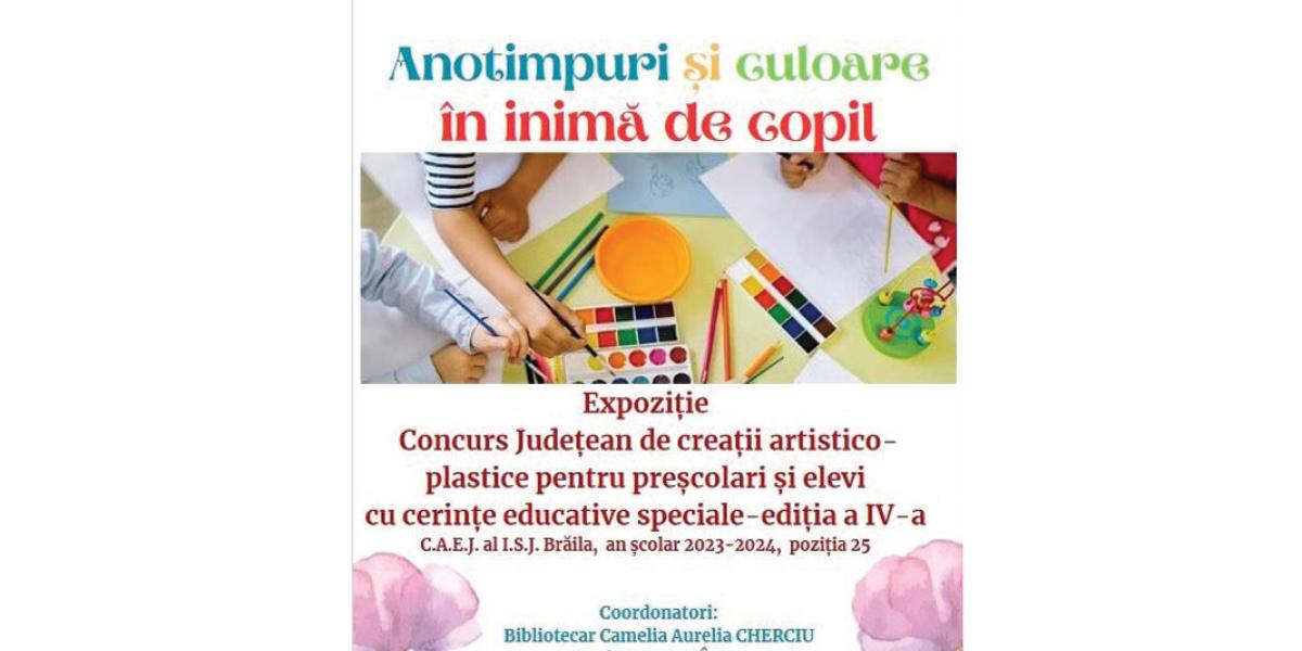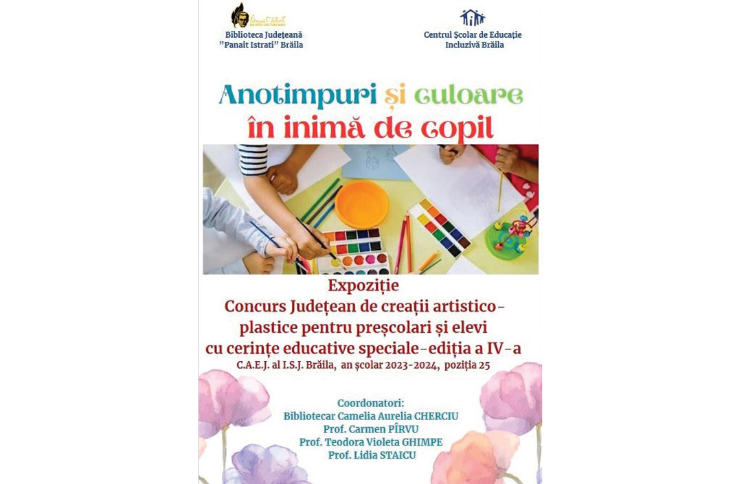 Biblioteca Județeană ”Panait Istrati” Brăila găzduiește o expoziție de creație plastică care cuprinde lucrările participanților la Concursul Județean de Arte vizuale ”Anotimpuri și culoare în inimă de copil” - ediția a IV-a.
