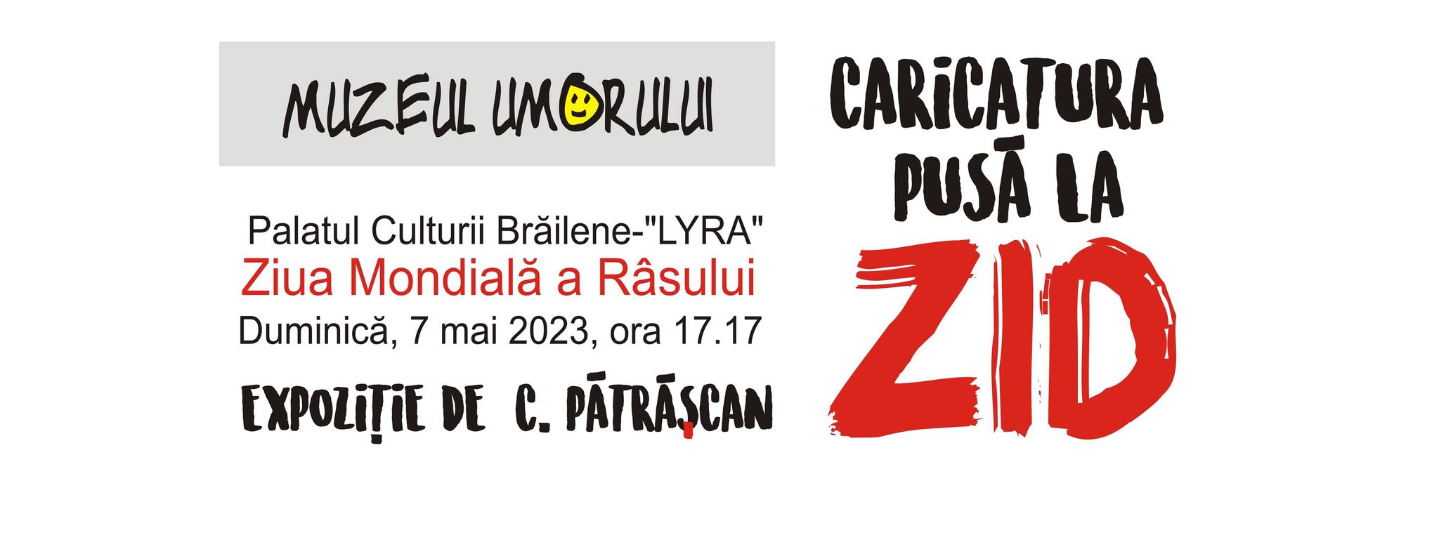 Duminică, 7 mai, de Ziua Mondială a Râsului, Costel Pătrășcan vă invită să sărbătoriți evenimentul la Muzeul Umorului, acolo unde puteți vedea expoziția ”Caricatura pusă la zid”. Expoziția poate fi vizitată începând cu ora 17.17.