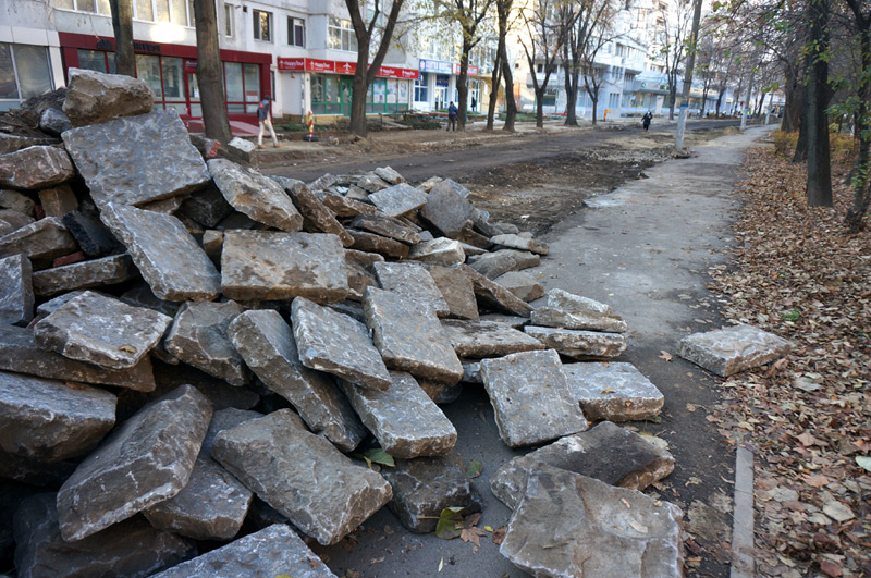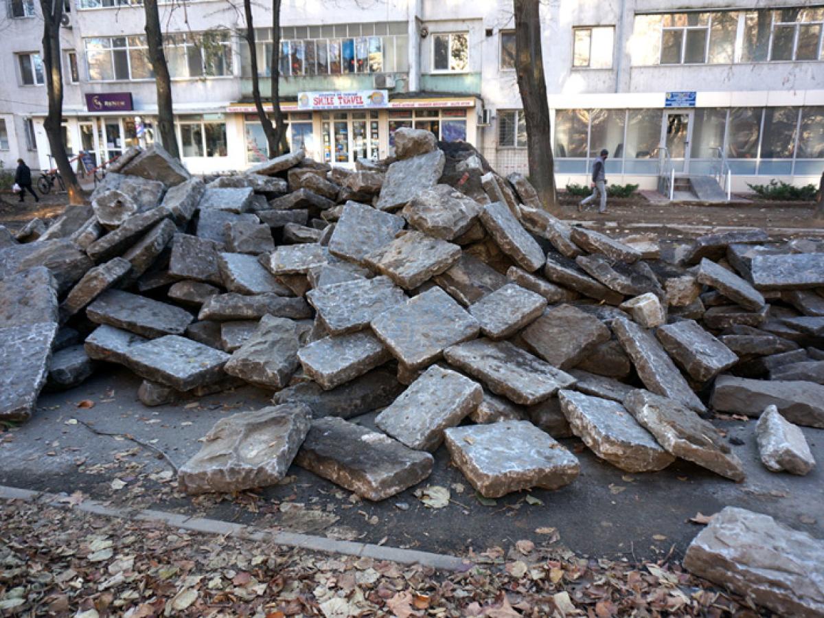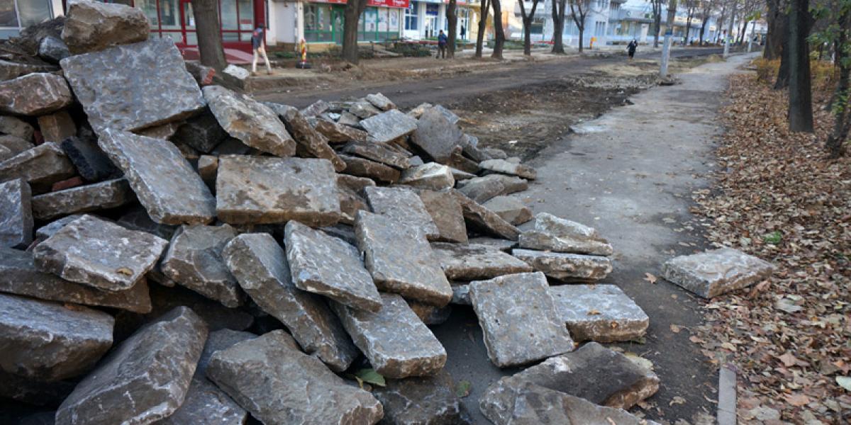 * în urma lucrărilor de decopertare au ieșit la iveală cantități importante de piatră cubică și lave folosite pe vremuri pentru pavarea trotuarelor și a carosabilului * primarul Dragomir ne-a declarat că tot ce se găsește va fi păstrat și folosit la amenajarea noilor parcări, respectiv la reabilitarea trotuarelor din Centrul Vechi * deși a început abia la finalul lunii octombrie, în prag de sezon rece, șantierul de pe bulevard are un ritm de lucru neașteptat de bun