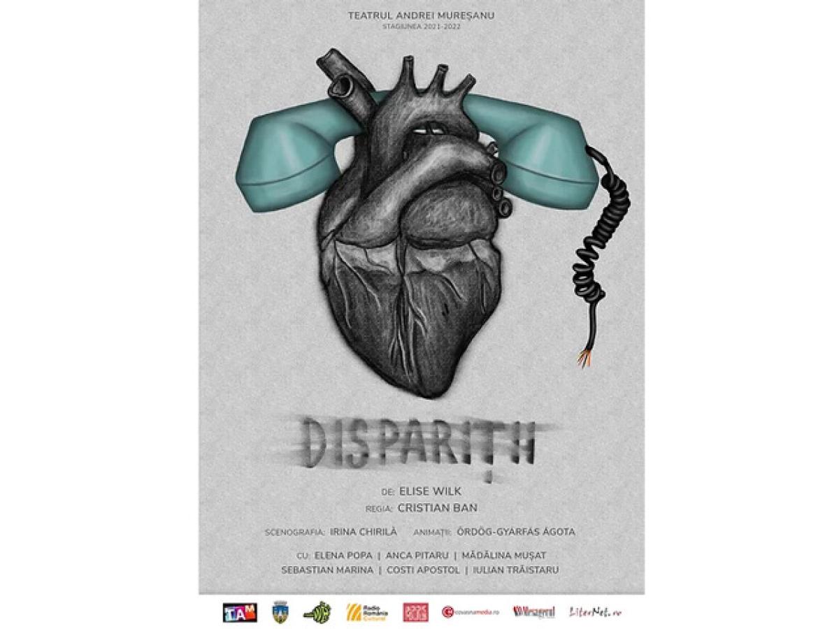 Spectacolul poate fi vizionat luni, 19 septembrie, de la ora 18.00, la Sala Mare. Din distribuția spectacolului ”Dispariții” fac parte actorii Elena Popa, Anca Pitaru, Mădălina Mușat, Sebastian Marina, Costi Apostol și Iulian Trăistaru. Scenografia: Irina Chirilă, Animație: Ördög Gyárfás Ágota.
