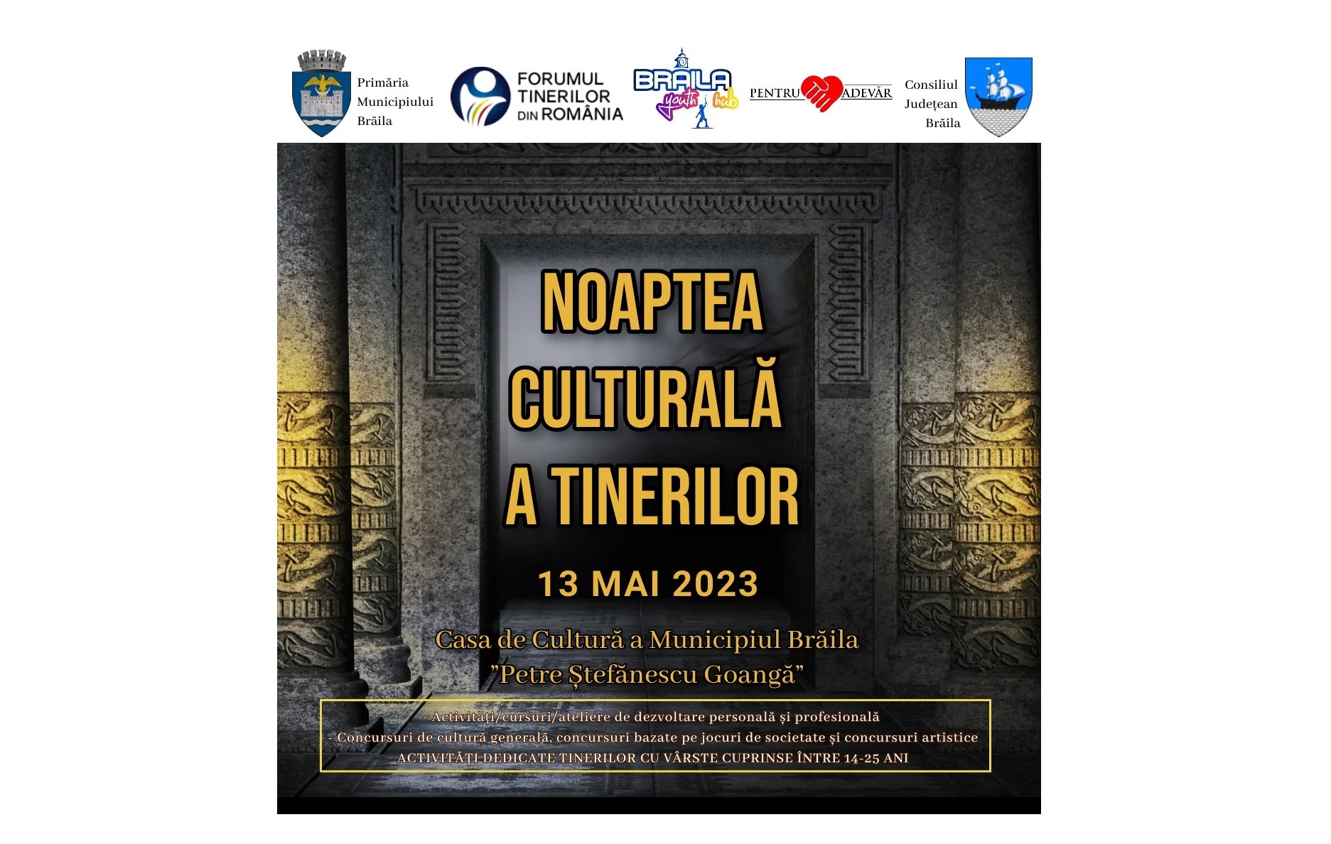 De ”Noaptea Muzeelor”, Forumul Tinerilor din România – Brăila și Centrul de Tineret - Brăila Youth Hub organizează un eveniment dedicat tinerilor. Vorbim mai exact despre ”Noaptea Culturală a Tinerilor”, care va avea loc sâmbătă, 13 mai, la Casa de Cultură a Municipiului Brăila ”Petre Ștefănescu Goangă”.