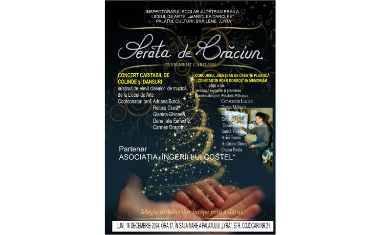 ”Vă așteptăm cu drag la mini concertul de colinde al elevilor de la secția muzică a Liceului de Arte, profesori coordonatori Adriana Burcă, Raluca Ciucă, Gianina Ghionea, și la Vernisajul expoziției și premierea la Concursul de creație plastică "C.B.Dondoș" in memoriam. Evenimentul este unul caritabil. Astfel, prin Asociația "Îngerii lui Costel" , fondurile obținute vor fi transformate în daruri de la Moș Crăciun, pentru 50 de copii de la Pechea, Jud. Galați. Vă așteptăm cu drag să dăruim împreună SPERANȚĂ și un Crăciun cu bucurie în sufletul unor copii!”, este mesajul organizatorilor.