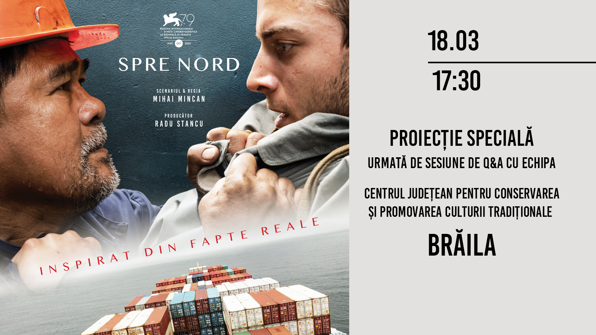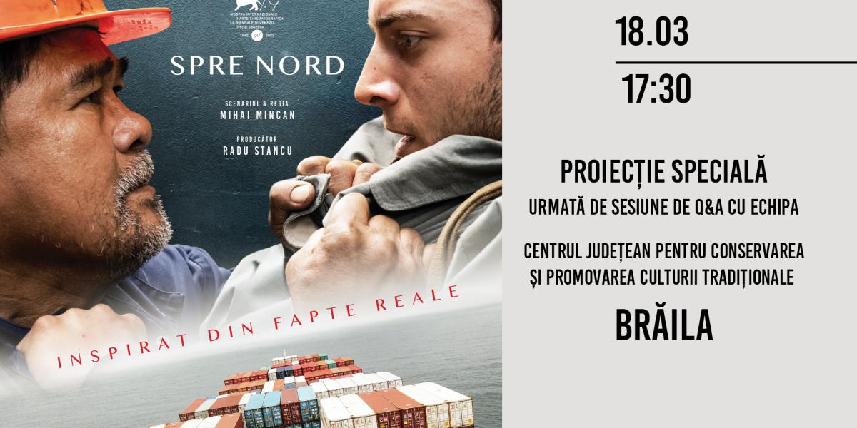 Thrillerul psihologic ”Spre Nord” (”To the Nord”), una dintre cele mai ambițioase producții ale cinematografiei românești din ultimii ani, în regia lui Mihai Mincan, ajunge la Brăila! Filmul va putea fi văzut, sâmbătă, 18 martie, de la ora 17.30, la Centrul de Creație Brăila (Centrul Județean pentru Conservarea și Promovarea culturii tradiționale Brăila), iar evenimentul va fi unul special deoarece membrii echipei vor veni în fața publicului brăilean. Este vorba despre regizorul Mihai Mincan și actorul în rol principal Niko Becker, care vor susține o sesiune de Q&A după vizionarea filmului.