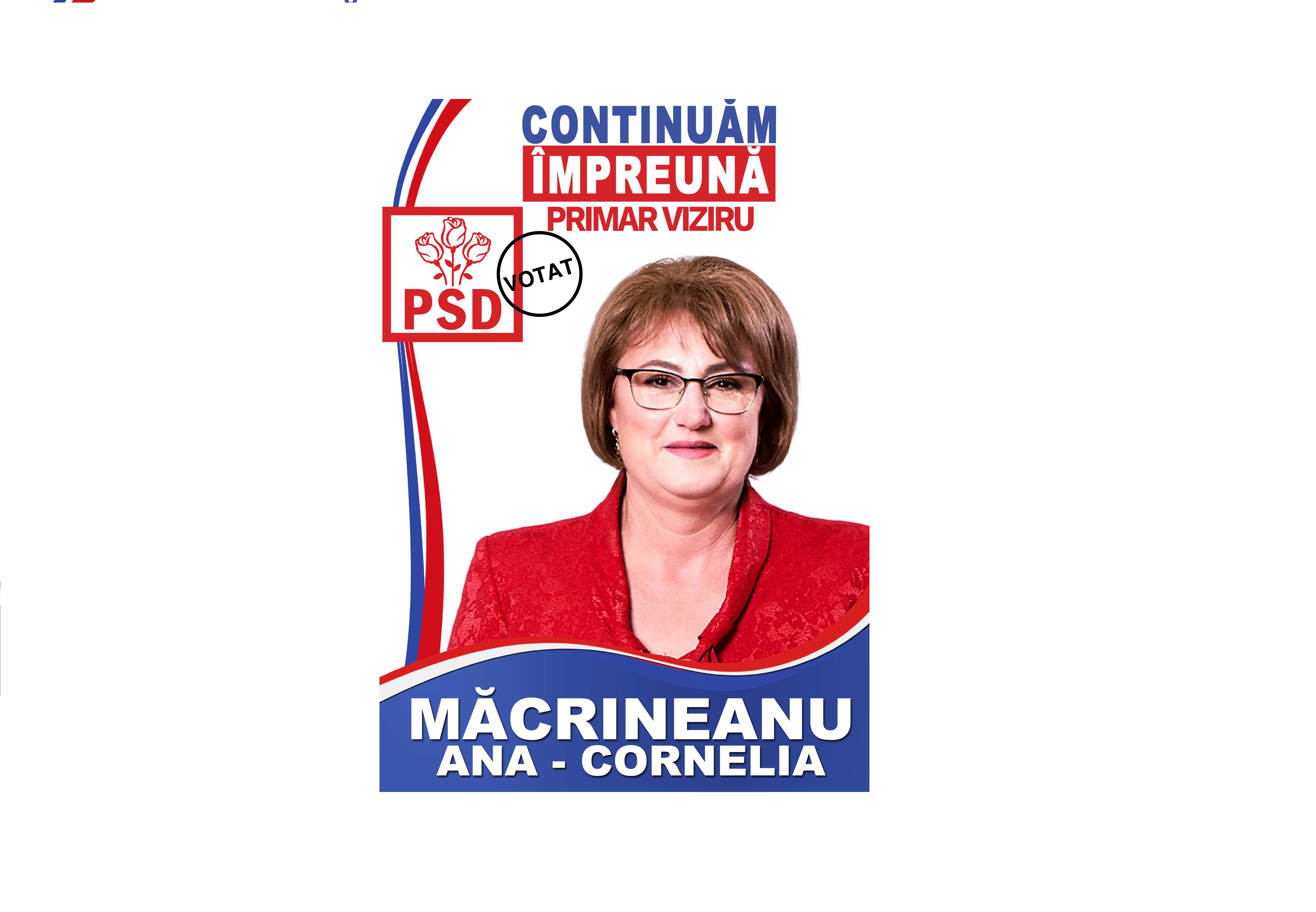 Viceprimarul Ana Cornelia Măcrineanu, candidatul Partidului Social Democrat la funcţia de primar al comunei Viziru, are 49 de ani, este căsătorită, are treicopii şi doi nepoţei. Este una din femeile pe care partidul le-a promovat şI susţinut în funcţii publice.