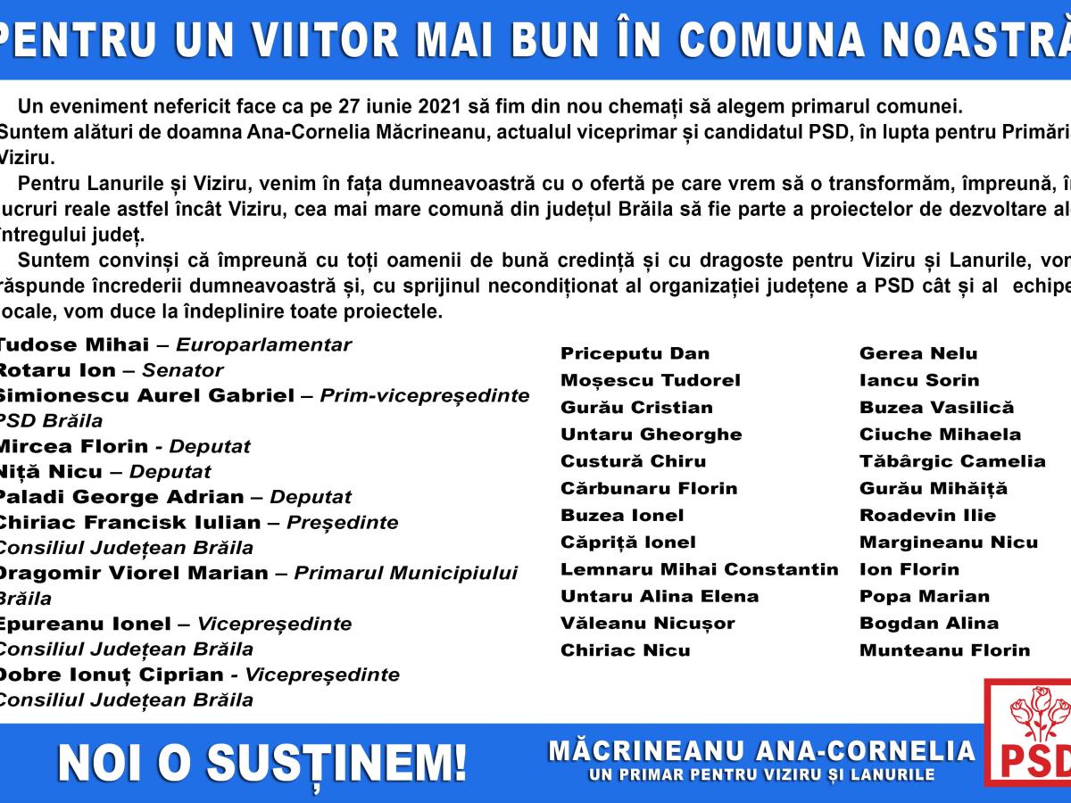 Echipa Partidului Social Democrat vă propune şansa la continuarea proiectelor de dezvoltare şi o totală implicare în rezolvarea problemelor cu care vizirenii se confruntă! Oamenii din Lanurile şi Viziru, în urmă cu doar câteva luni şi-au pus toată încrederea în echipa PSD! Vă propunem acum, ca pe 27 iunie să votaţi din nou echipa PSD: Ana Cornelia Măcrineanu, este primarul care oferă şanse reale de dezvoltare Comunei Viziru. Ana Cornelia Măcrineanu este primarul cu care Comuna Viziru va merge mai departe!