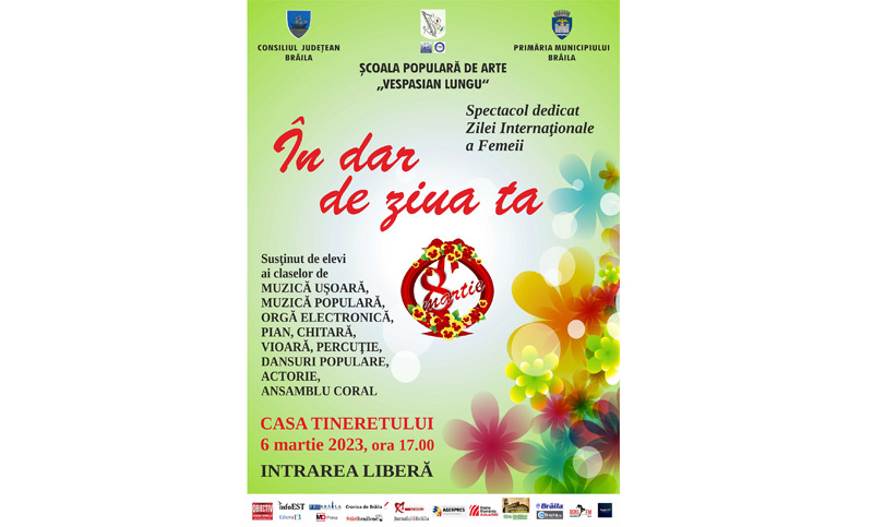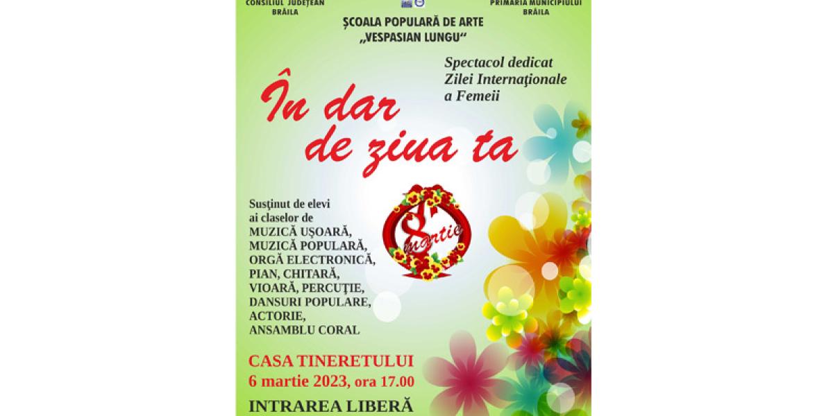 Astfel, potrivit managerului Cristian Morozan, Școala Populară de Arte și Meserii „Vespasian Lungu” Brăila, cu sprijinul Consiliului Județean și al Primăriei Municipiului Brăila, organizează luni, 6 martie a. c., de la ora 17.00, spectacolul „În dar de ziua ta”. Spectacolul va avea loc la Casa Tineretului și este dedicat Zilei Internaționale a Femeii, sărbătorită an de an, pe 8 martie.