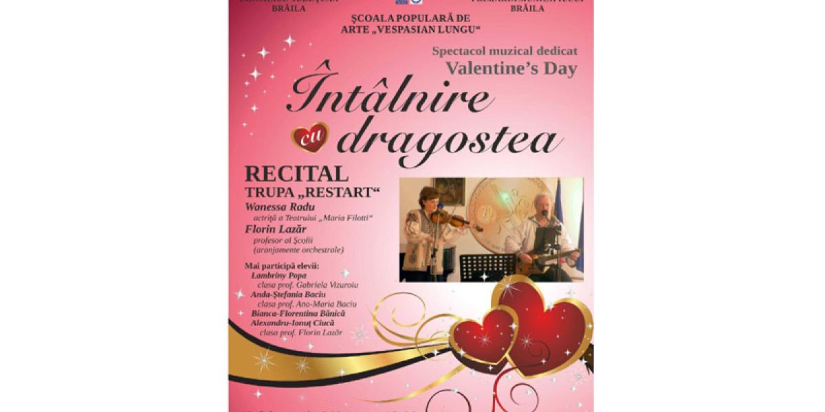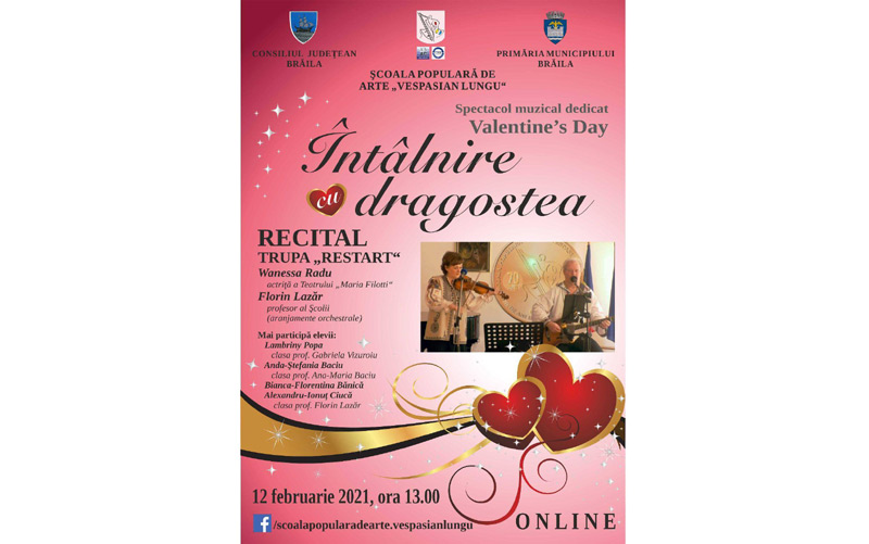 Școala Populară de Arte "Vespasian Lungu" Brăila, cu sprijinul Consiliului Județean Brăila și al Primăriei Municipiului Brăila, organizează, de Valentine’s Day, spectacolul muzical online „Întâlnire cu dragostea”.