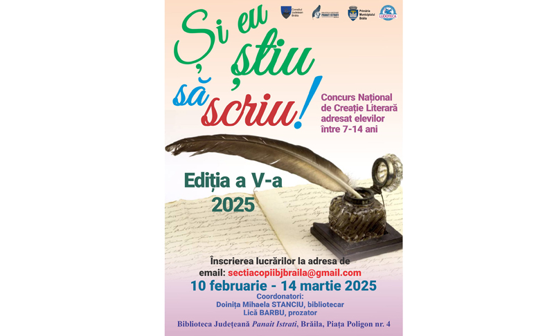 Biblioteca Județeană „Panait Istrati” Brăila organizează, în perioada următoare, Concursul Naţional de Creaţie Literară „Şi eu ştiu să scriu!”, ediţia a V-a, adresat copiilor cu vârste între 7 și 14 ani.