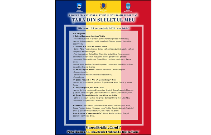 Muzeul Brăilei „Carol I” găzduiește miercuri, 23 octombrie, ora 16:00, la sediul central din Piața Traian nr. 3 (Sala „Regele Ferdinand I și Regina Maria”), un grandios spectacol de muzică și poezie organizat de Colegiul Economic „Ion Ghica” Brăila, în parteneriat cu Liceul de Arte „Hariclea Darclée”, Palatul Copiilor, Școala Populară de Arte „Vespasian Lungu”, Colegiul Național „Ana Aslan” și Școala Gimnazială Lanurile, comuna Viziru.