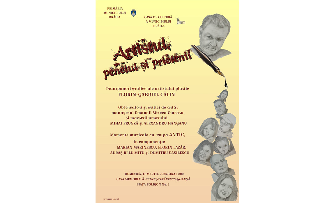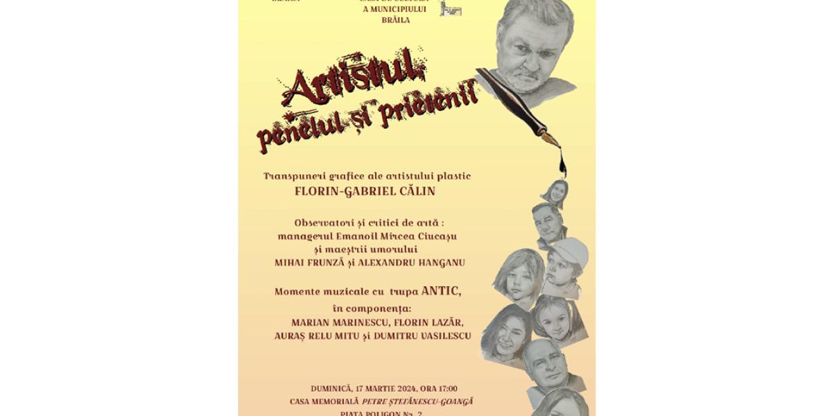 Astfel, potrivit comunicatului trimis de organizatori, Casa de Cultură a Municipiului Brăila îi invită pe brăileni duminică, 17 martie, începând cu ora 17.00, la Casa Memorială „Petre Ştefănescu-Goangă”, din Centrul Istoric al orașului (Piața Poligon nr. 2), la vernisajul Expoziției de desene a artistului plastic Florin-Gabriel Călin. Expoziția, intitulată „Artistul, penelul și prietenii”, include desene în creion ce surprind diverse expresii, fizionomii ale unor personaje (artiști, șefi de instituții, copii etc.) care au ca numitor comun prietenia cu artistul.
