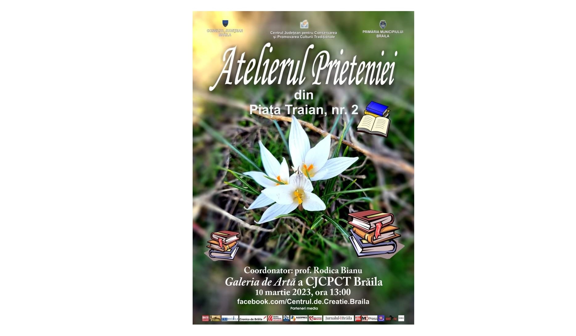 Consiliul Judeţean Brăila - prin Centrul Judeţean pentru Conservarea şi Promovarea Culturii Tradiţionale (Centrul de Creație) - și Primăria Municipiului Brăila organizează, începând de vineri, 10 martie, în incinta Galeriei de Artă, „Atelierul prieteniei din Piața Traian nr.2”, un inedit club de lectură coordonat de doamna profesor Rodica Bianu.