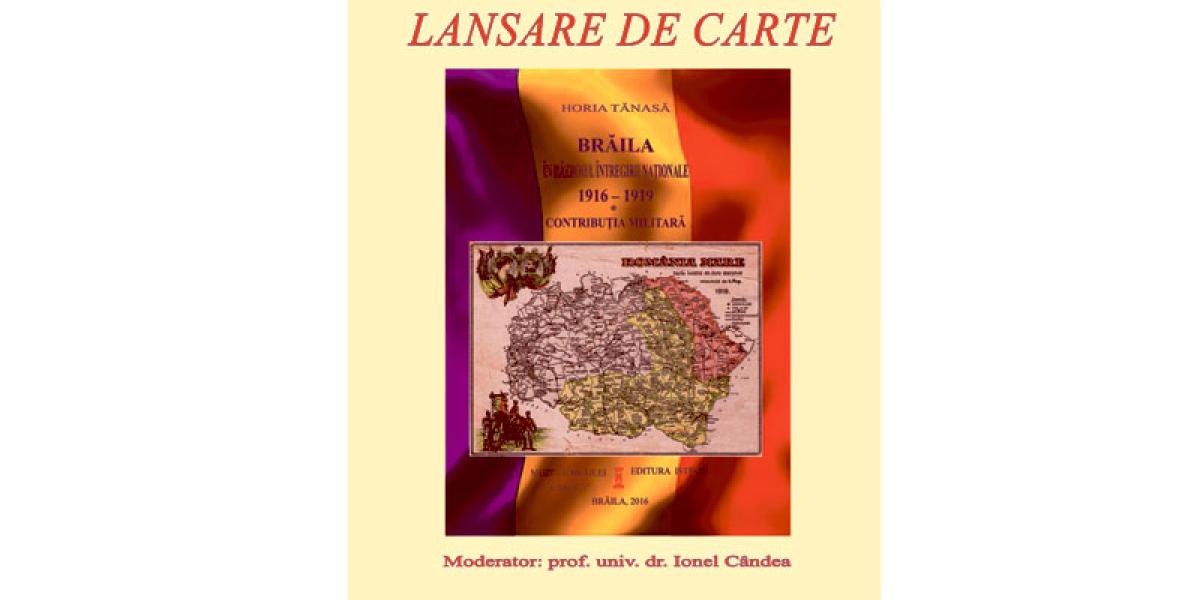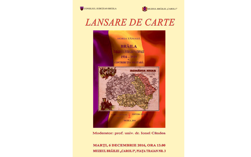 Marţi, 6 decembrie, la Sala de conferinţe a Muzeului Brăilei „ Carol l” va avea loc lansarea cărţii „Brăila în războiul întregirii naţionale 1916 -1919. Vol l - Contribuţia militară”, sub semnătura col.r. Horia Tănasă, apărut la editura Istros a Muzeului Brăilei. Evenimentul începe la ora 13.00 şi are invitaţi de seamă: Înaltpreasfinţitul Părinte Arhiepiscop dr. Casian al Dunării de Jos; reprezentanţi ai Administraţiei Publice locale; Comandantul Garnizoanei Brăila, col. Soare Gheorghe; şeful Serviciului Istoric al Armatei Brăila; şeful Asociaţiei Naţionale Cultul Eroilor „Regina Maria” – filiala Brăila; elevi şi profesori ai Colegiilor Naţionale brăilene: „Nicolae Bălcescu”, „Nicolae Iorga”, „Gheorghe Munteanu Murgoci” şi Liceului Pedagogic „D. P. Perpessicius” Brăila. Moderator va fi prof. univ. dr. Ionel Cândea, managerul Muzeului Brăilei „Carol I”.