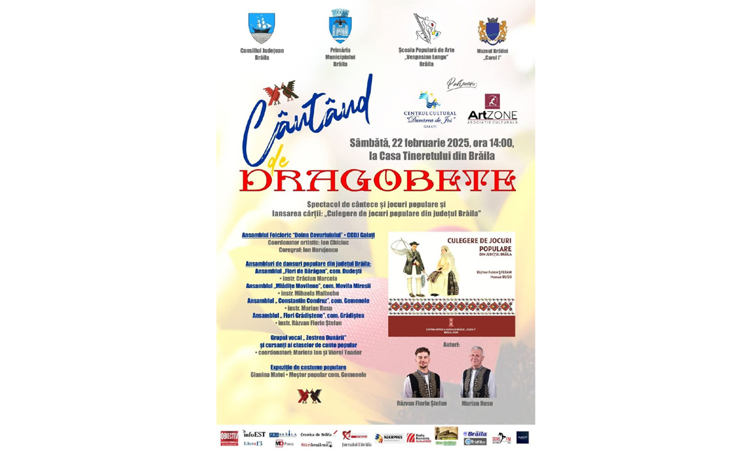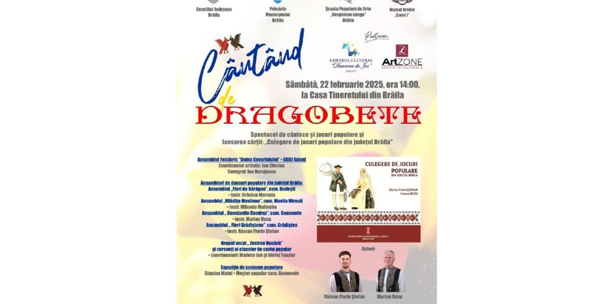 „Vă invităm să ne fiți alături la Casa Tineretului din Brăila, pentru un eveniment cu totul special. „Cântând de Dragobete” este o sărbătoare a dragostei pentru folclor și un eveniment în care veți descoperi artiști dintre cei mai talentați și îndrăgostiți de arta populară. În plus, avem onoarea de a găzdui și de a vă invita la lansarea volumului „Culegere de jocuri populare din județul Brăila”, precizează organizatorii evenimentului de sâmbătă.