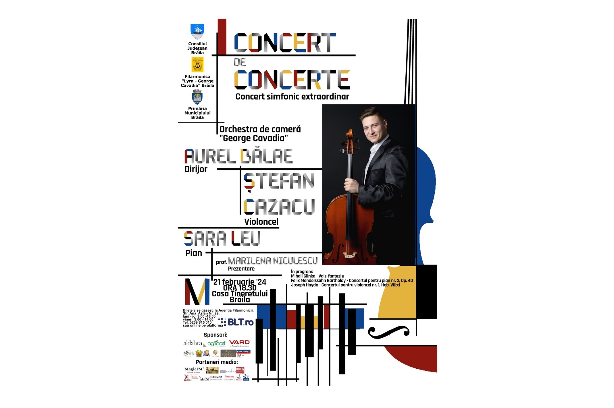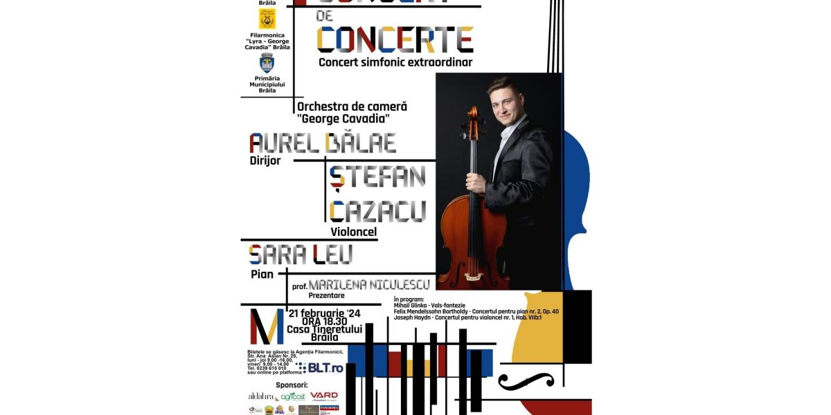 „Ștefan Cazacu, violoncelist de prim rang, cu o tehnică impecabilă și o virtuozitate firească, și Sara Leu, pianistă în formare, ce își face debutul alături de orchestră în prezența dumneavoastră, vor fi invitații evenimentului eclatant din seara zilei de 21 februarie 2024, ora 18.30, de la Casa Tineretului. Căci filarmonica brăileană este organismul viu care dă avânt tinerei generații de muzicieni și îi sprijină constant în demersul lor nobil, dar dificil deopotrivă. Concertul extraordinar ce se va făuri din dorința dumneavoastră de grandoare prin cultură va avea ca pilon principal Orchestra de cameră „George Cavadia” Brăila, sub conducerea dirijorală a lui Aurel Bălae, o structură care vă aduce de fiecare dată emoție în suflete”, precizează, într-un comunicat, prof. Alexandra Gurgu, secretar muzical al Filarmonicii „Lyra - George Cavadia” Brăila.