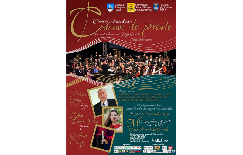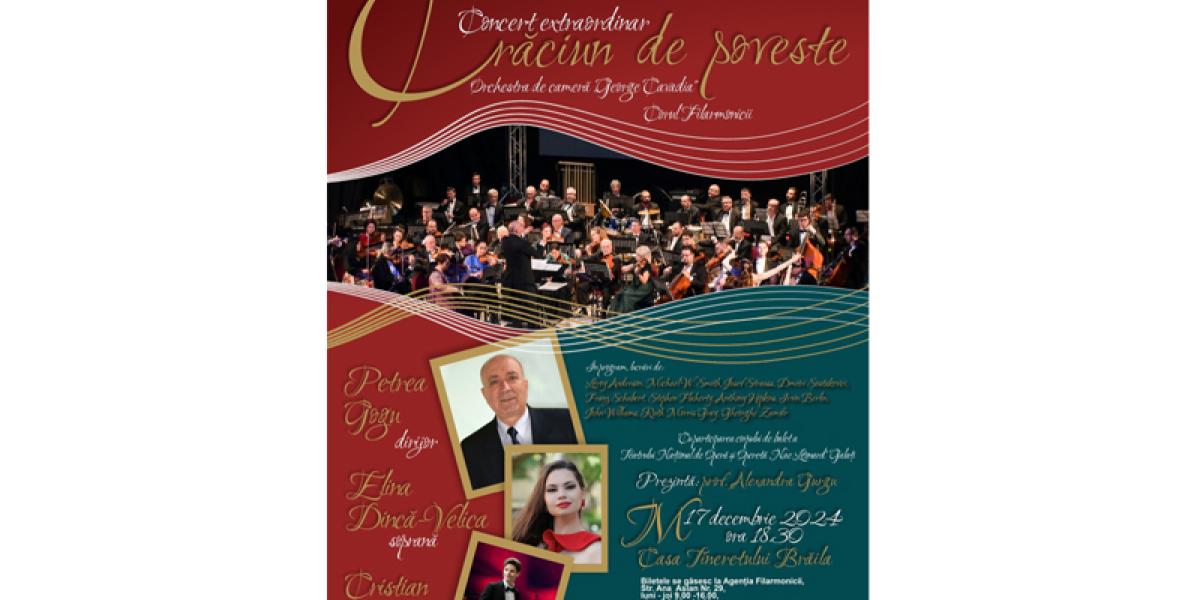 „Crăciun de poveste” este numele Concertului extraordinar de Sfintele Sărbători, organizat marți, 17 decembrie, de la ora 18:30, pe scena Casei Tineretului, de către Consiliul Județean, Filarmonica „Lyra - George Cavadia” și Primăria Municipiului Brăila. Evenimentul de excepție va aduce laolaltă Orchestra de Cameră „George Cavadia” Brăila, dirijată de maestrul Petrea Gogu, soprana Elina Dincă-Velica, genialul naist brăilean Cristian Ceaușu - câștigătorul show-ului „Românii au talent”, Corul Filarmonicii, precum și Corpul de balet al Teatrului Național de Operă și Operetă „Nae Leonard” Galați. Prezentarea concertului va fi asigurată de prof. Alexandra Gurgu, secretar muzical al Filarmonicii „Lyra - George Cavadia” Brăila.