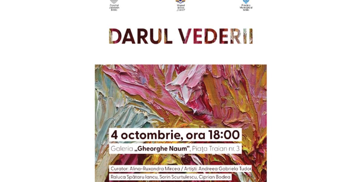 Muzeul Brăilei „Carol I” îi invită pe iubitorii de artă și de frumos sâmbătă, 4 octombrie, începând cu ora 18:00, la vernisajul Expoziției „Darul vederii”. Deschisă în spațiul Galeriei „Gheorghe Naum”, expoziția aduce împreună lucrări recente de pictură și grafică ale artiștilor Andreea Gabriela Tudor, Raluca Spătaru Iancu, Sorin Scurtulescu și Ciprian Bodea.