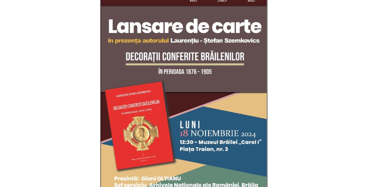 Muzeul Brăilei „Carol I” îi invită pe brăilenii pasionați de lectură și de istorie în ziua de luni, 18 noiembrie, ora 12:30, la lansarea volumului „Decorații conferite brăilenilor în perioada 1876-1905”, eveniment ce se va desfășura în prezența autorului, dr. Laurențiu-Ștefan Szemkovics. Volumul a apărut anul acesta la Editura Istros a Muzeului Brăilei „Carol I”. Evenimentul se va desfășura la sediul central al Muzeului Brăilei „Carol I”, din Piața Traian nr. 3, Sala „Regele Ferdinand I și Regina Maria”.