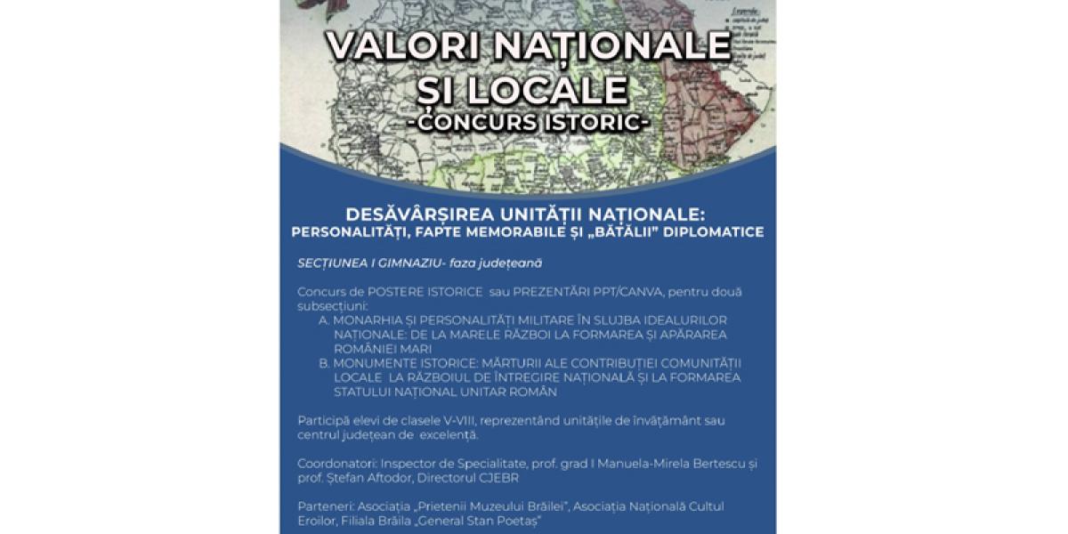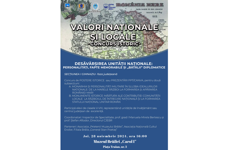 Muzeul Brăilei „Carol I” găzduiește joi, 28 noiembrie, începând cu ora 16:00, la sediul central din Piața Traian nr. 3, Concursul istoric cu tema „Desăvârșirea unității naționale: personalități, fapte memorabile și „bătălii” diplomatice”, în cadrul proiectului „Valori naționale și locale”, organizat de Inspectoratul Școlar Județean Brăila (IȘJ) și Centrul Județean de Excelență Brăila (CJEBR) - secțiunea Gimnaziu (faza județeană). Participă elevi de clasele V-VIII reprezentând unitățile de învățământ sau Centrul Județean de Excelență Brăila, precum și elevi din Republica Moldova.
