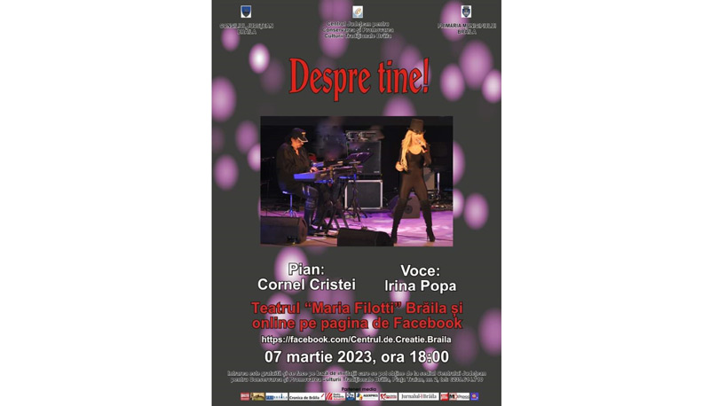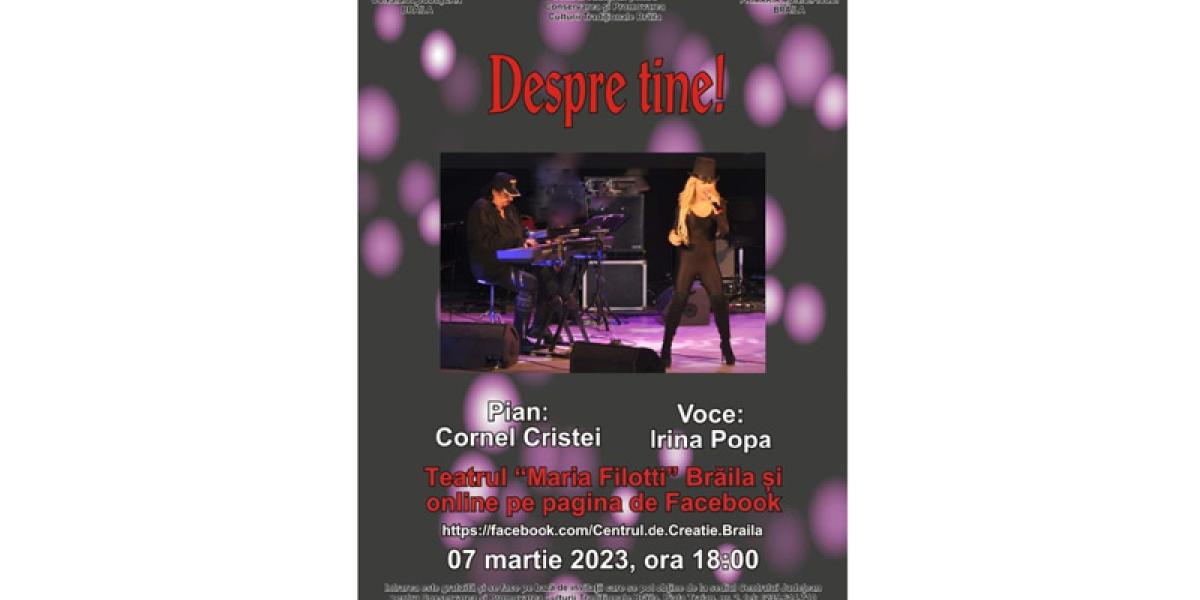 Centrul Județean pentru Conservarea și Promovarea Culturii Tradiționale Brăila (Centrul de Creație), în colaborare cu Consiliul Județean și Primăria Municipiului Brăila organizează marți, 7 martie 2023, începând cu ora 18.00, evenimentul cultural intitulat „Despre tine!” - program artistic spectaculos și impresionant de muzică pop-rock și jazz, un show exploziv, „o colaborare a claviaturistului Cornel Cristei, inspiratul compozitor și aranjor, cu Irina Popa, considerată, atât de fani, cât și de comentatorii de specialitate, ca fiind una dintre cele mai valoroase și autentice voci de gen din țara noastră, o prezență scenică pur și simplu electrizantă”.