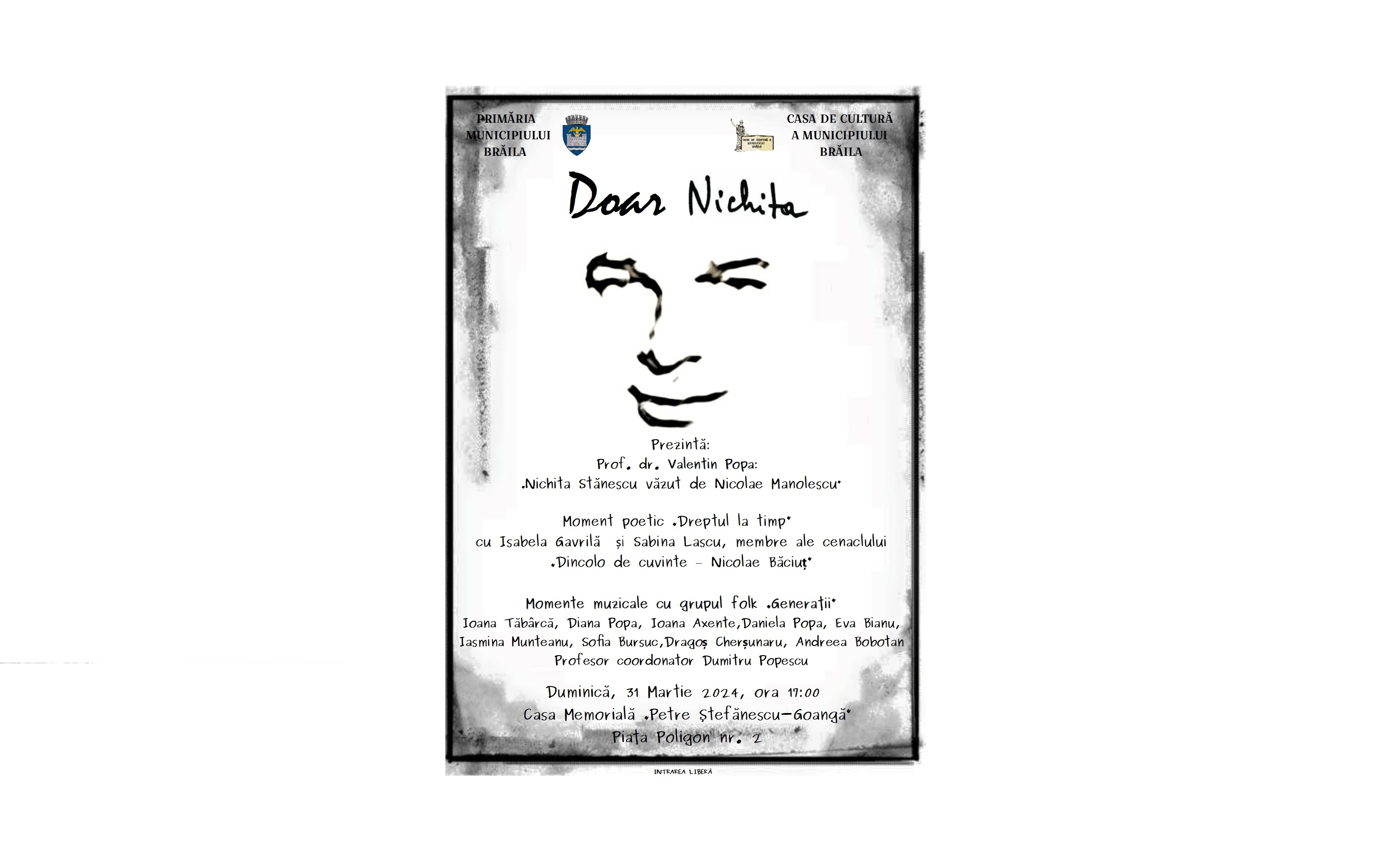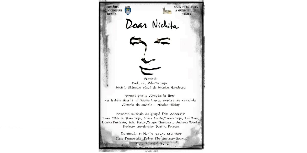„Doar Nichita” este declarația-invitație a Casei de Cultură a Municipiului Brăila adresată brăilenilor pentru ziua de duminică, 31 martie, zi în care se împlinesc 91 de ani de la nașterea unuia dintre cei mai de seamă scriitori pe care i-a avut limba română, regratatul Nichita Stănescu.