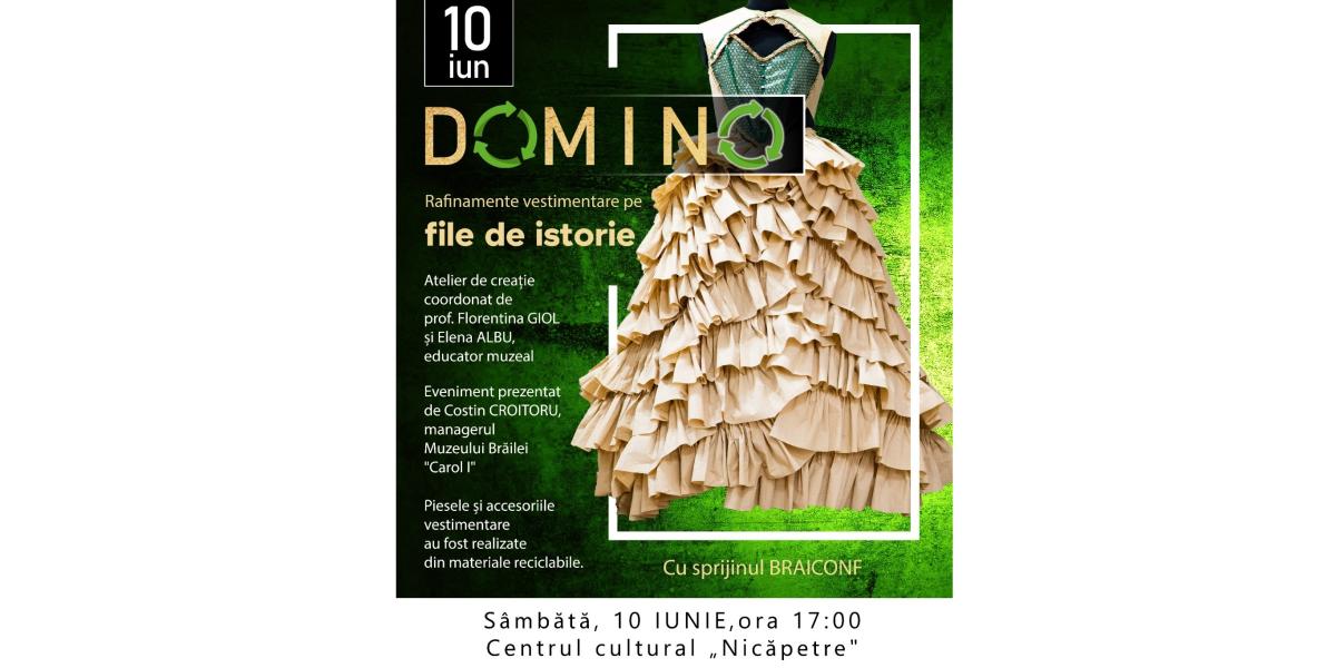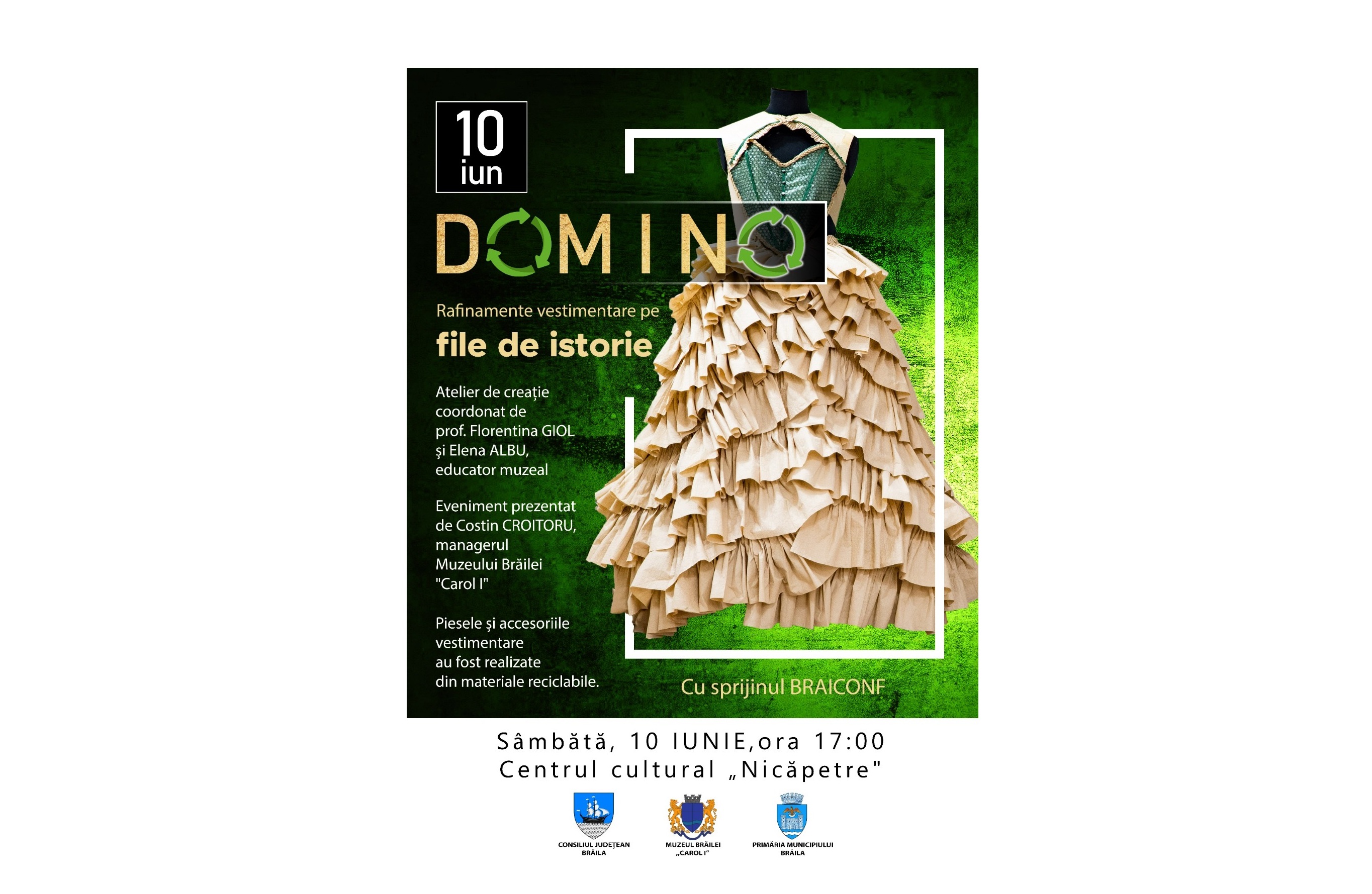 Sâmbătă, 10 iunie, de la ora 17.00, la Centrul Cultural „Nicăpetre” (Casa Embiricos, Strada Belvedere nr. 1) aparținând Muzeului Brăilei „Carol I”, va fi organizat atelierul de creație vestimentară intitulat „Domino. Rafinamente vestimentare pe file de istorie”.