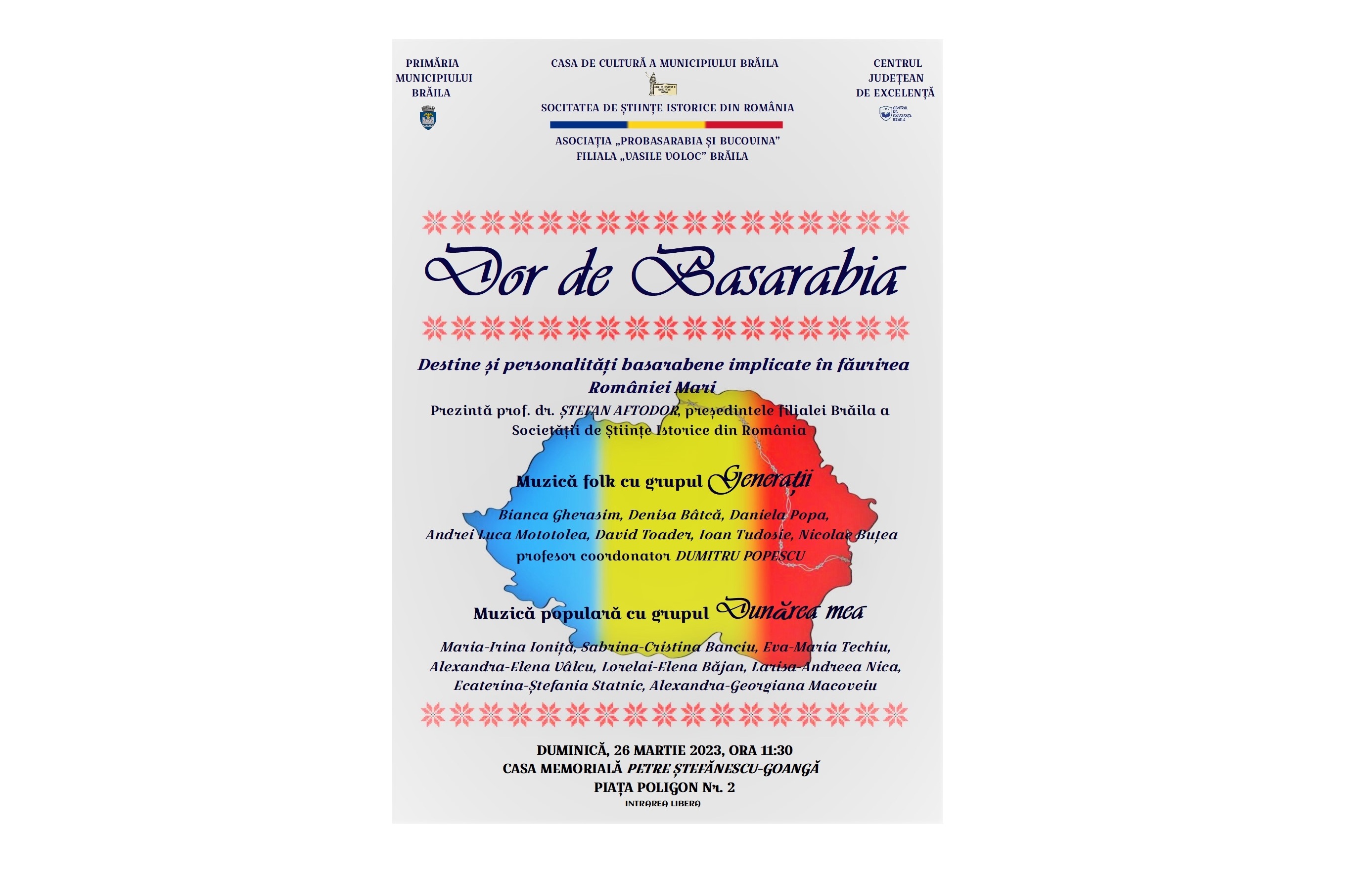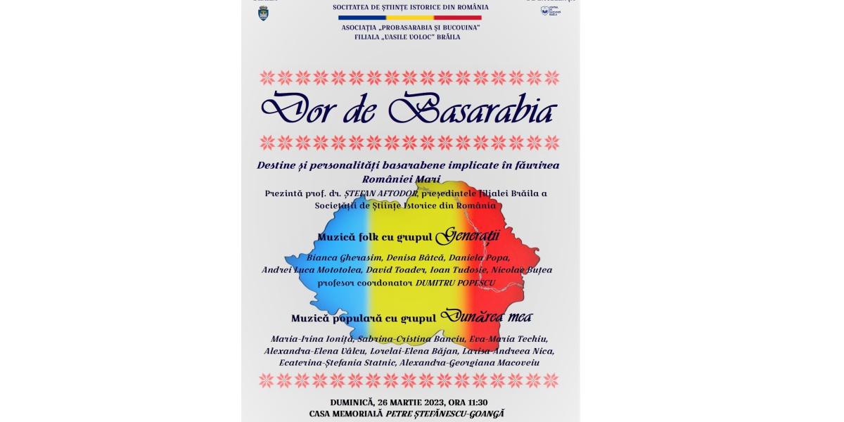 „Dor de Basarabia”. Sub acest generic, Casa de Cultură a Municipiului Brăila, în colaborare cu Asociaţia „ProBasarabia şi Bucovina” - filiala „Vasile Voloc” Brăila, Societatea de Ştiinţe Istorice din România și Centrul Județean de Excelență Brăila, organizează o manifestare cultural-artistică prilejuită de împlinirea a 105 ani de la Unirea Basarabiei cu România. Evenimentul are loc duminică, 26 martie 2023, începând cu ora 11.30, la Casa Memorială „Petre Ştefănescu-Goangă”, din Piaţa Poligon nr. 2.
