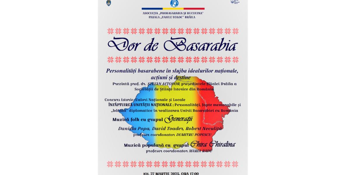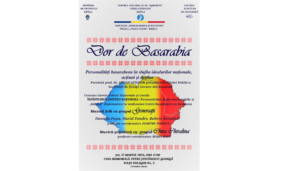 Centrul Cultural și de Agrement „Chira Chiralina” Brăila, în colaborare cu Societatea de Ştiinţe Istorice din România - Filiala Brăila, Centrul Județean de Excelență Brăila şi Asociația „ProBasarabia și Bucovina” - Filiala „Vasile Voloc” Brăila, organizează joi, 27 martie, începând cu ora 17:00, manifestarea culturală intitulată „Dor de Basarabia”, prilejuită de împlinirea a 107 de ani de la Unirea Basarabiei cu România. Evenimentul se va desfășura la Casa Memorială „Petre Ştefănescu-Goangă”, monument istoric din Piața Poligon nr. 2 (Centrul Istoric al municipiului Brăila).