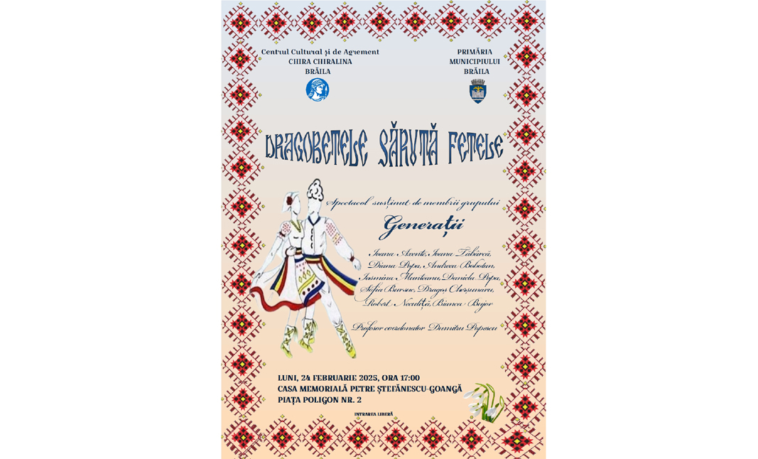 • evenimentul, care va avea loc luni, 24 februarie, începând cu ora 17:00, este organizat de Centrul Cultural și de Agrement „Chira Chiralina” Brăila • vor evolua membrii Grupului „Generații”, coordonați de prof. Dumitru Popescu