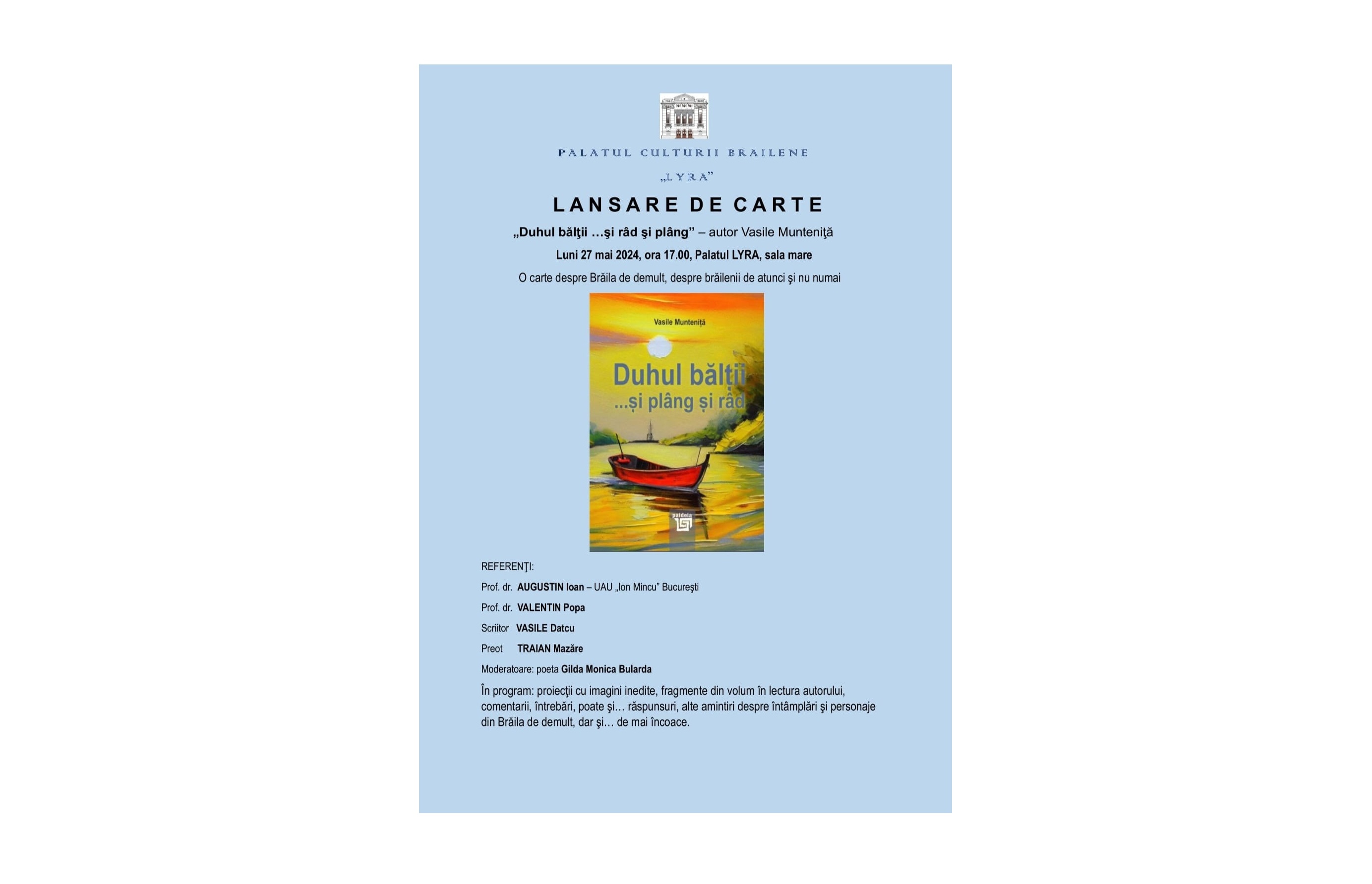 Scoasă de sub tipar la Editura Paideia, cartea lui Vasile Munteniță, „Duhul Bălții... și râd și plâng”, va fi prezentată de: prof. dr. Augustin Ioan, UAU „Ion Mincu” București, prof. dr. Valentin Popa, scriitor, scriitorul Vasile Datcu, revoluționar, și preotul Traian Mazăre, de la Biserica „Sfinții Împărați Constantin și Elena”. Moderator al evenimentul cultural va fi poeta Gilda Monica Bularda.