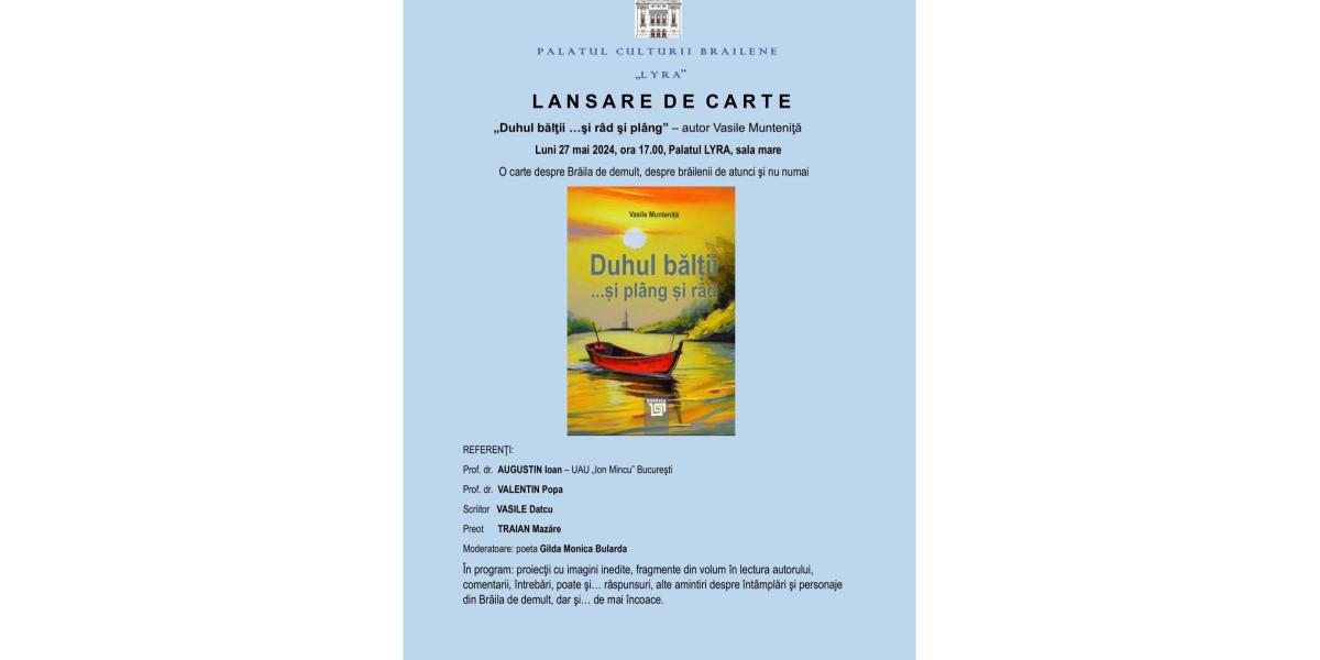 Eveniment editorial și, totodată, filantropic la Brăila. În ziua de luni, 27 mai, ora 17.00, Sala mare a Palatului Culturii Brăilene Lyra, din Centrul Istoric al Municipiului, va găzdui lansarea celui de-al patrulea volum de proză al ing. Vasile Munteniță, „Duhul Bălții... și râd și plâng”, „o carte despre Brăila de demult, despre brăilenii de atunci și numai”. Banii strânși în urma vânzării volumului vor fi donați pentru Bogdi, băiețelul bolnav de cancer.