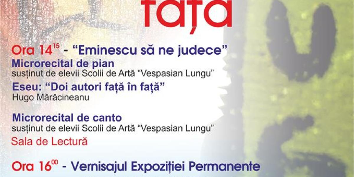 Luni, 15 ianuarie 2018, începând cu ora 14.15, la Biblioteca Județeană „Panait Istrati” este programat evenimentul „Eminescu să ne judece”. În cadrul manifestării va avea loc un microrecital de canto și pian susținut de elevii Școlii de Artă „Vespasian Lungu” și prezentarea eseului „Doi autori față în față”, susținută de artistul plastic Hugo Mărăcineanu.