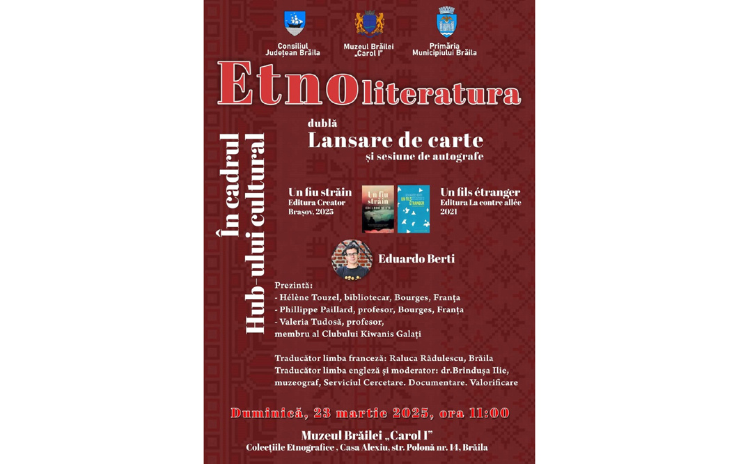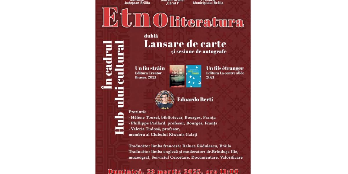 Începând cu ora 11:00, publicul brăilean este invitat la lansarea cărții în limba română „Un fiu străin”, Editura Creator, Brașov, 2025, și a cărții în limba franceză „Un fils étranger”, Editura „La contre allée”, 2021, autor Eduardo Berti, Buenos Aires, Argentina.