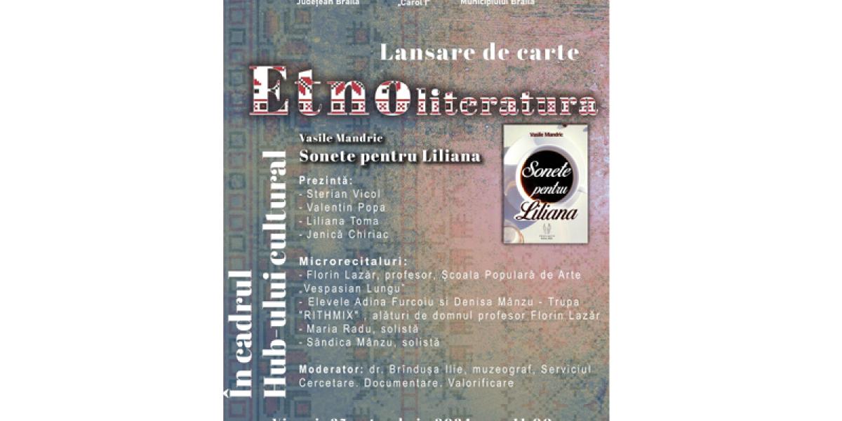 Vineri, 25 octombrie, începând cu ora 11:00, la Muzeul Brăilei „Carol I” - Colecțiile Etnografice (Casa Alexiu, monument istoric de pe Strada Polonă nr.14), în cadrul Hub-ului cultural „Etnoliteratura”, va avea loc lansarea volumului „Sonete pentru Liliana”, de Vasile Mandric. Prezintă: Sterian Vicol, Valentin Popa, Liliana Toma și Jenică Chiriac.