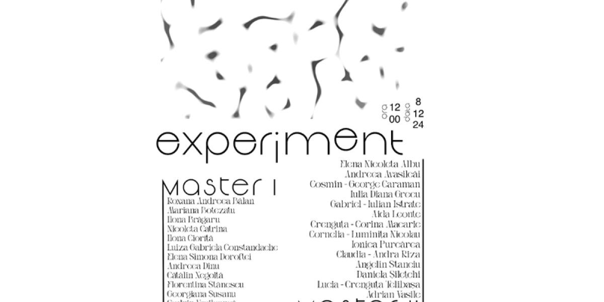 Pe simezele Expoziției „Experiment” vor fi prezenți cu cele mai semnificative creații următorii masteranzi: Albu Elena Nicoleta, Avasilcăi Andreea, Bălan Roxana Andreea, Botezatu Mariana, Brăgaru Ilona, Caraman Cosmin George, Catrina Nicoleta, Ciorița Ilona, Dinu Andreea, Grecu Iulia Diana, Istrate Gabriel Iulian, Leonte Aida, Macarie Crenguța Corina, Negoiță Cătălin, Nicolau Cornelia Luminița, Purcarea Ionica, Riza Claudia Andra, Stanciu Angelin, Stănescu Florentina, Siletchi Daniela, Susanu Georgiana, Telibașa Lucia Crenguța, Vasile Adrian, Vasiloancă Codrin.